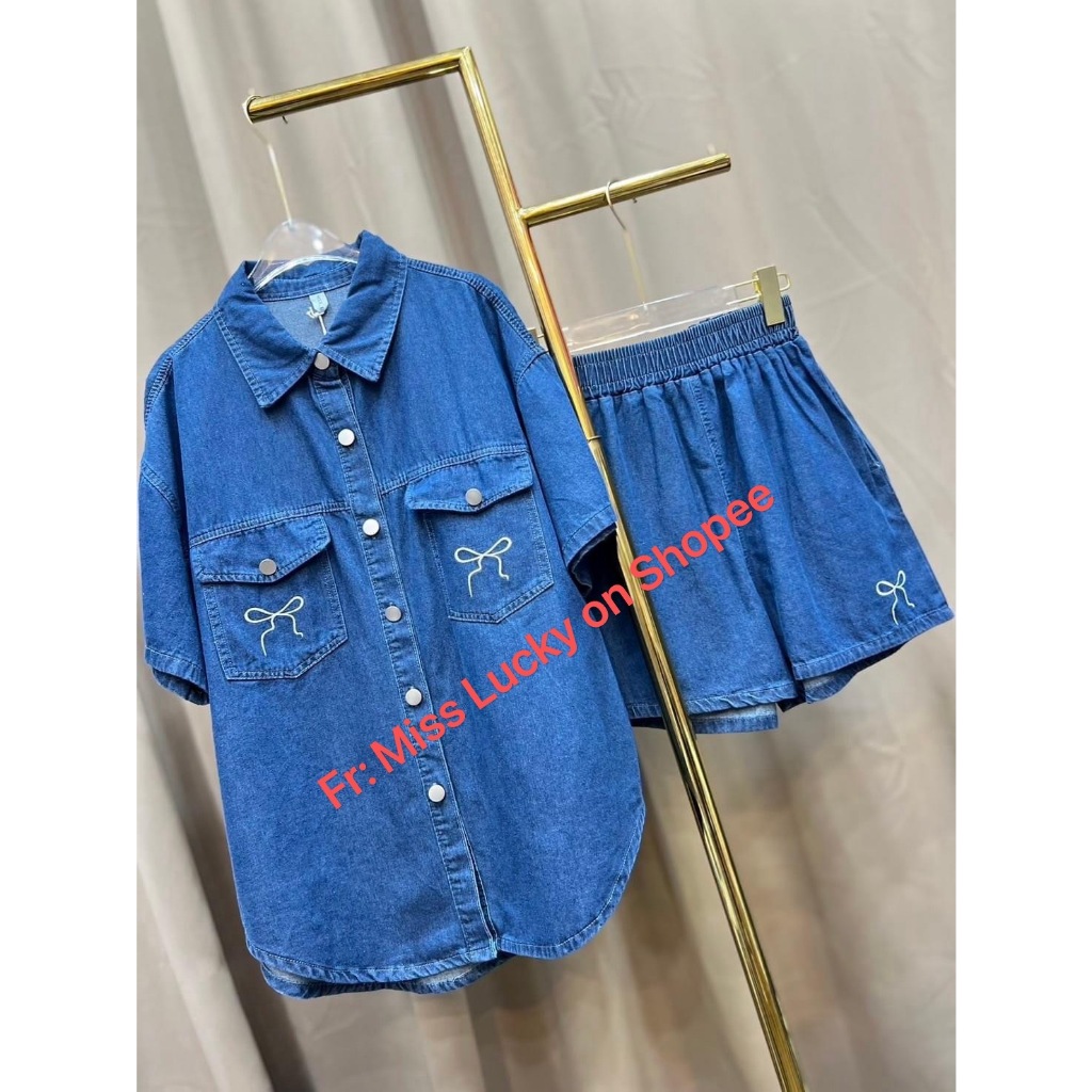 Miss Lucky Bangkok Women's Trendy Denim Short Sleeve Embroidery Ribbon & Shorts Coordinates Set 2020