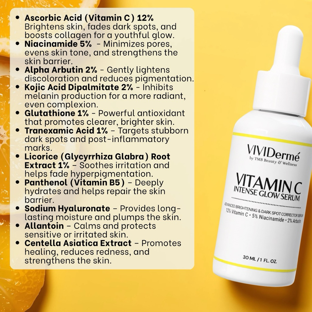 TMB VIVIDermé 12% VITAMIN C INTENSE GLOW SERUM | 10% VITAMIN C FACIAL SERUM | 10% Niacinamide Serum