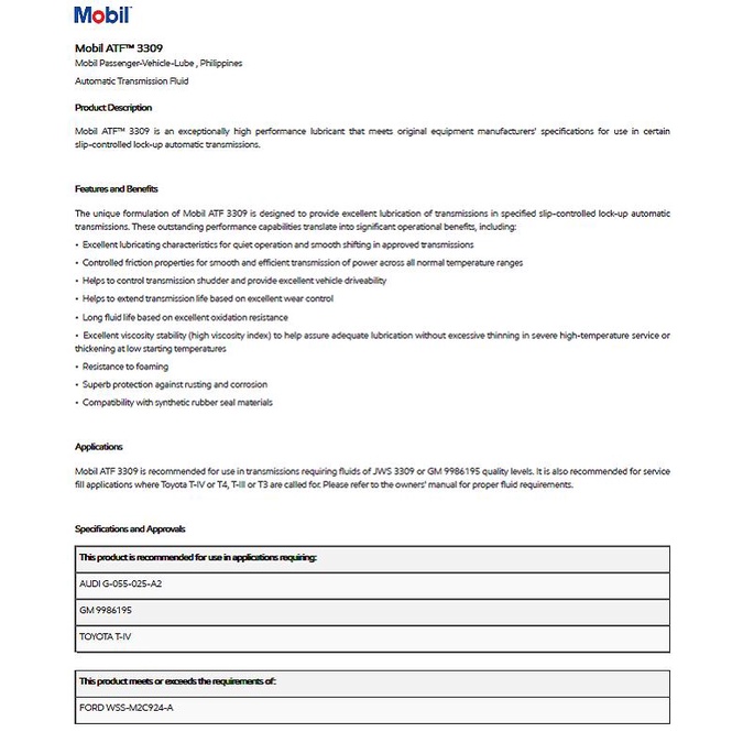 Mobil ATF 3309 Automatic Transmission Fluid (946ml) (PROMO PRICE)