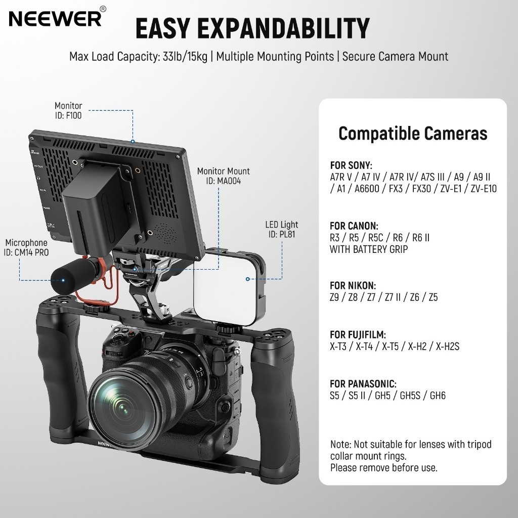 NEEWER Universal Camera Cage & Top Handle with 3/8" ARRI Locating Pins Kit, Video Rig Camera Stabilizer with Arca Type Base, Dual Handgrips, Compatible with SmallRig Accessories