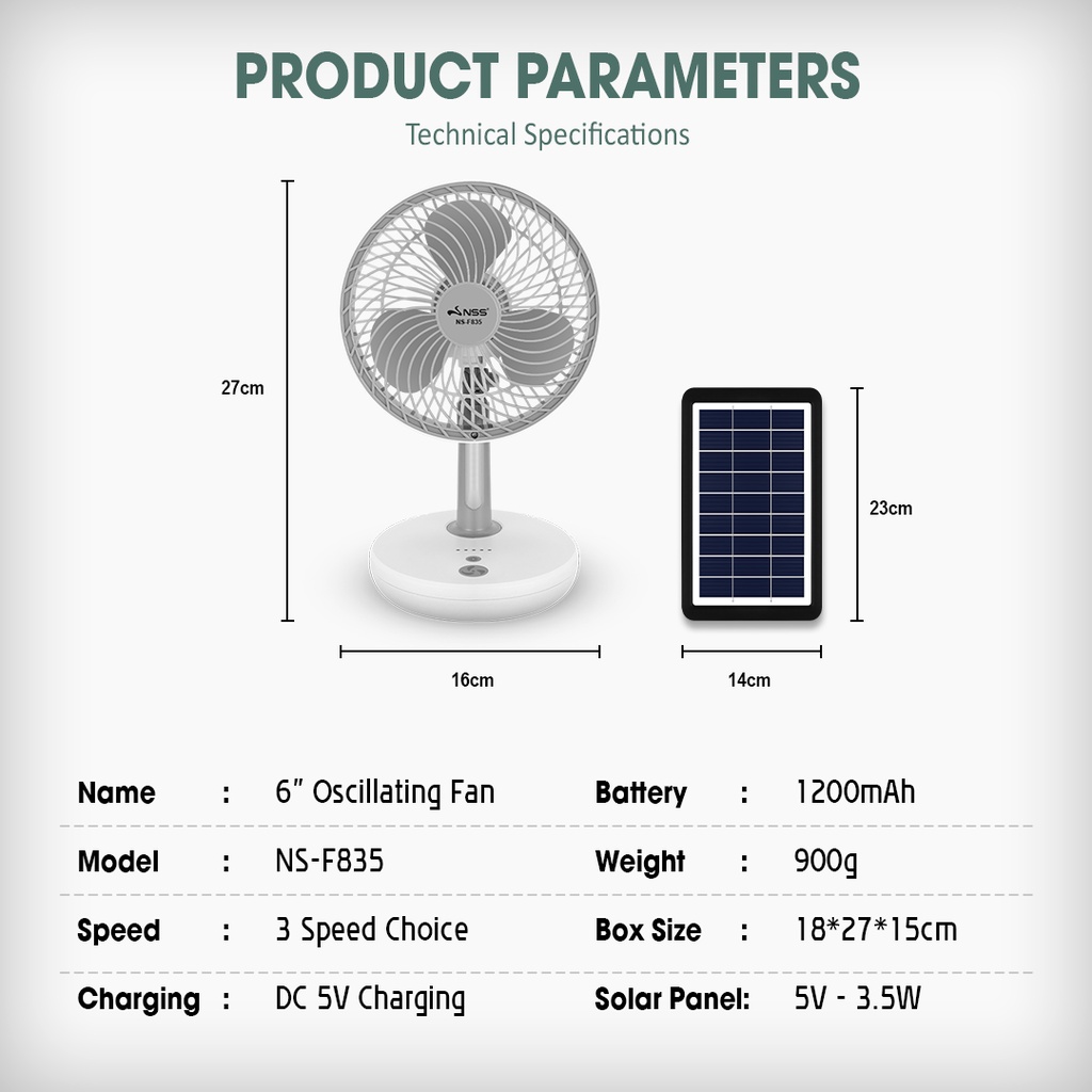 NSS Rechargeable Fan Solar Electric Fan Portable 3.5W Waterproof Solar Panel Led Light Desk Fan