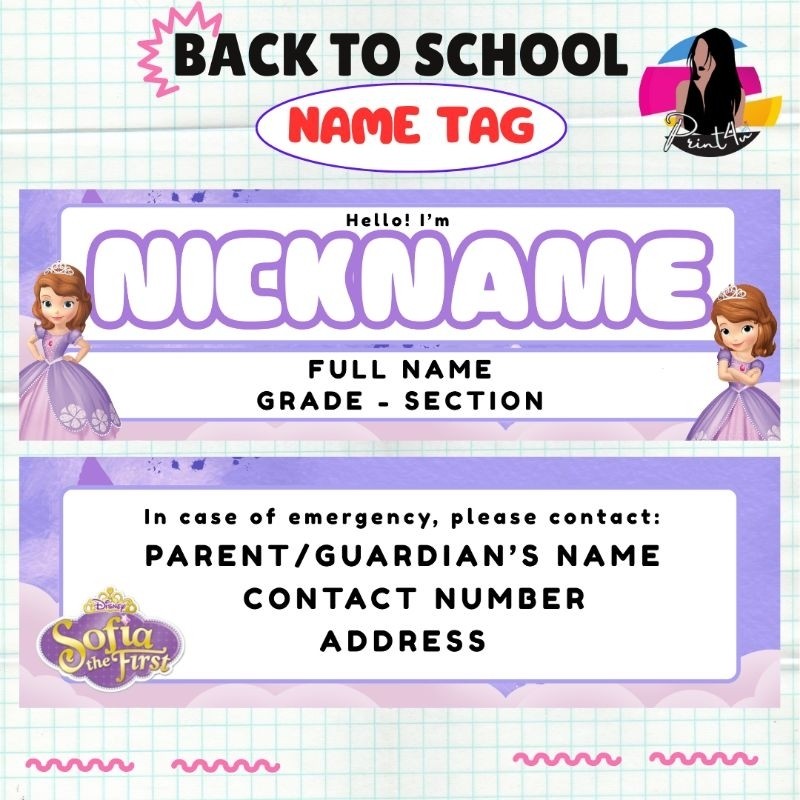 Name Tag Sofia The First Laminated Nameplate for students - Back to School Kids