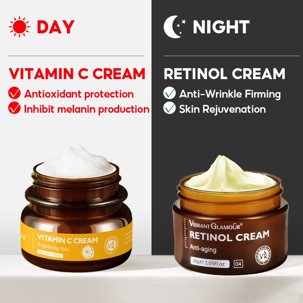 VIBRANT GLAMOUR Naturals Retinol Cream + Vitamin C Face Cream Set Whitening Anti-Aging Facial Moisturizer Anti-wrinkle Reduce Freckles Fade Dark Spots Repair Skin Care 2pcs