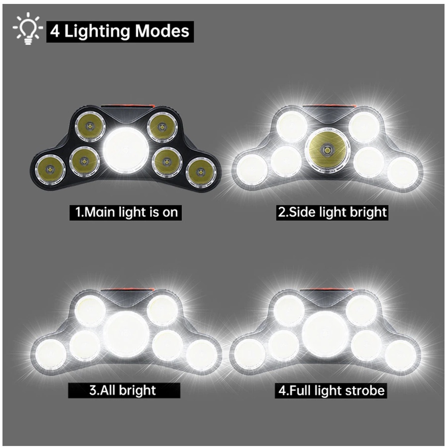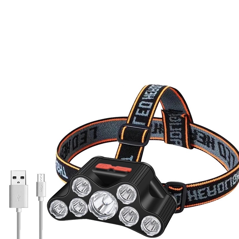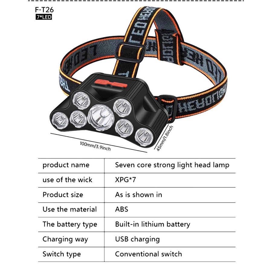 New F-T26 Rechargeable USB Head Mounted 7 LED Super Bright Headlight, IPX5 Waterproof,