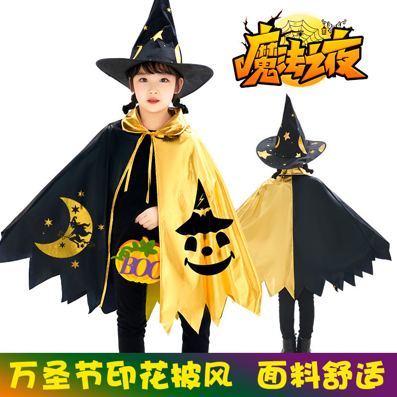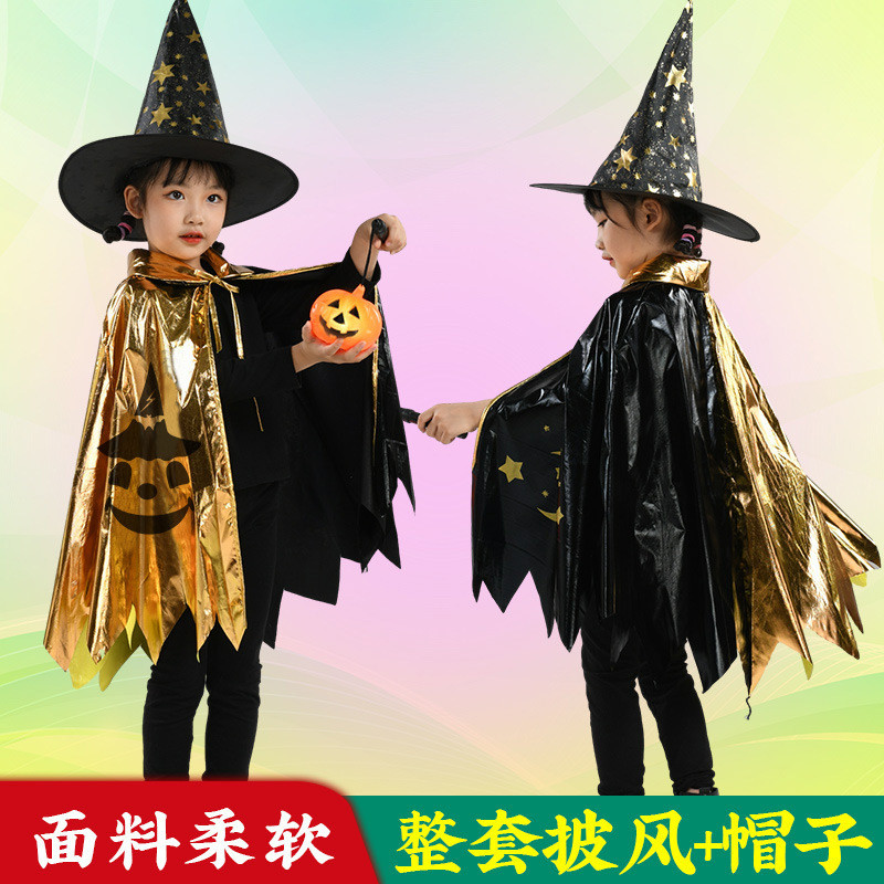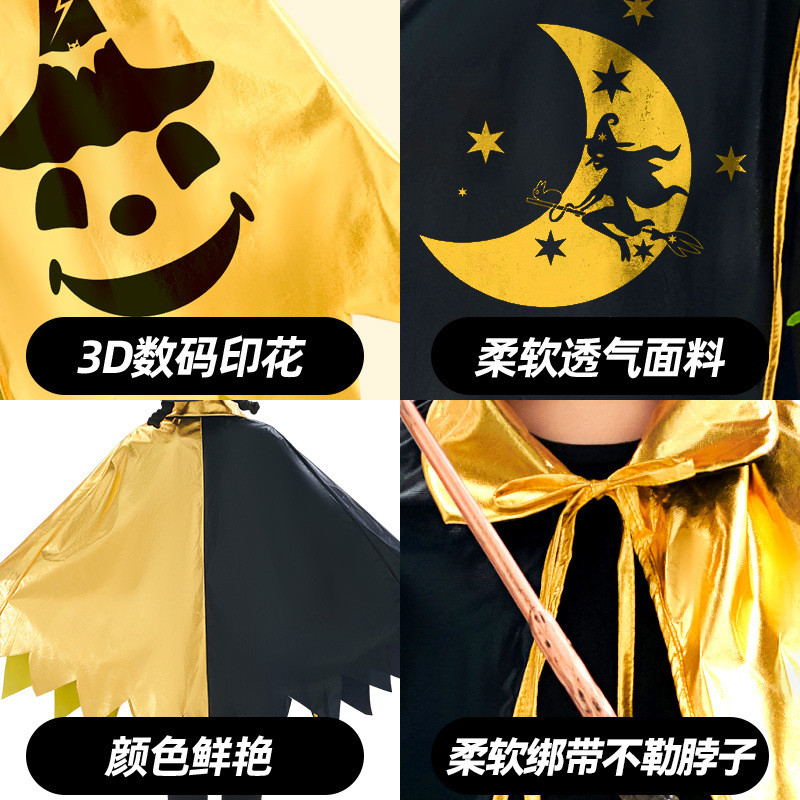 New Halloween Children's Magician Cape Star Cape 5-star Black Gold Wizard Costume Hat Set