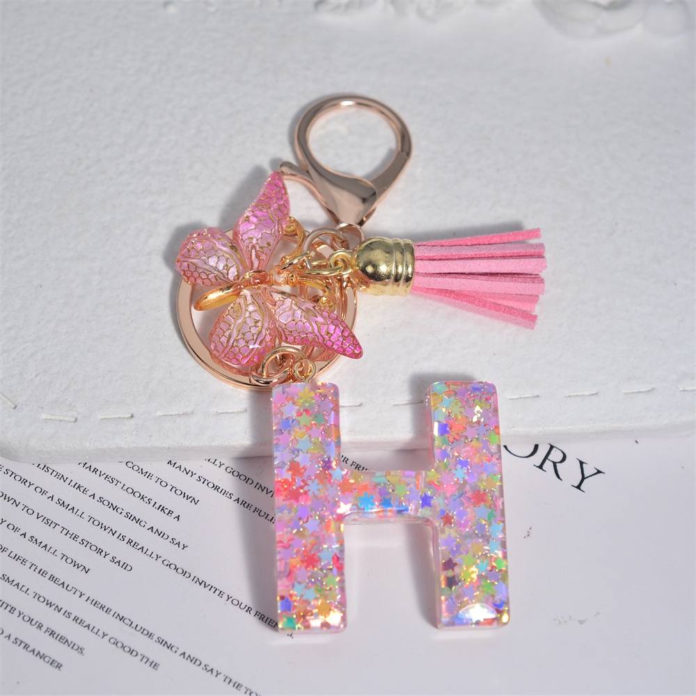 New Pink Resin A-Z Initials Letters Keychain Tassel Butterfly Pendant Keyring for Girls Women Purse Handbag Car Keys Accessories