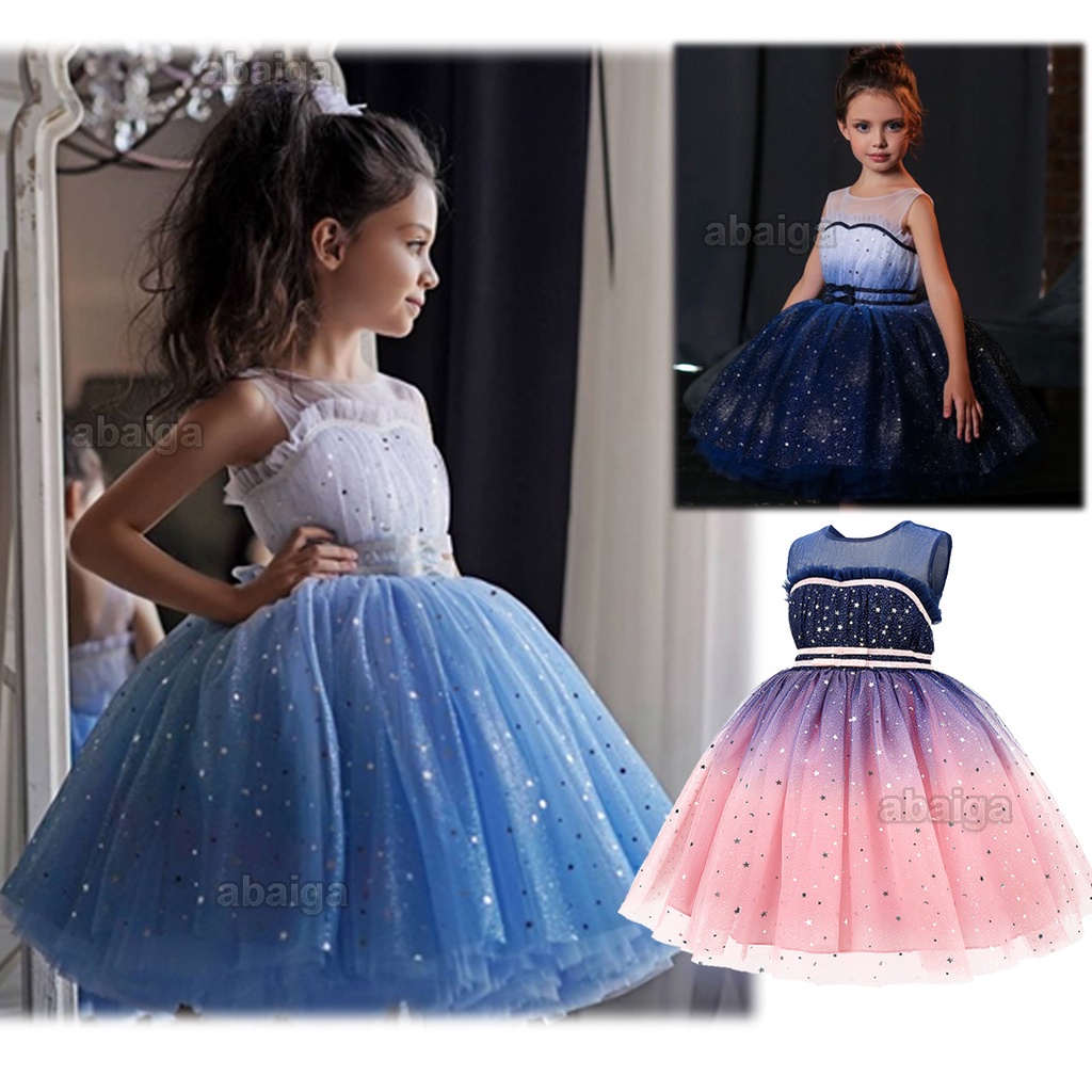 New Sky Blue Dress for Kids 5 Years Old Girl Princess Gradient Lace Sleeveless Dress Children Party Dresses Up Star Sequins Wedding Formal Gown Birthday Photo Shoot Outfit