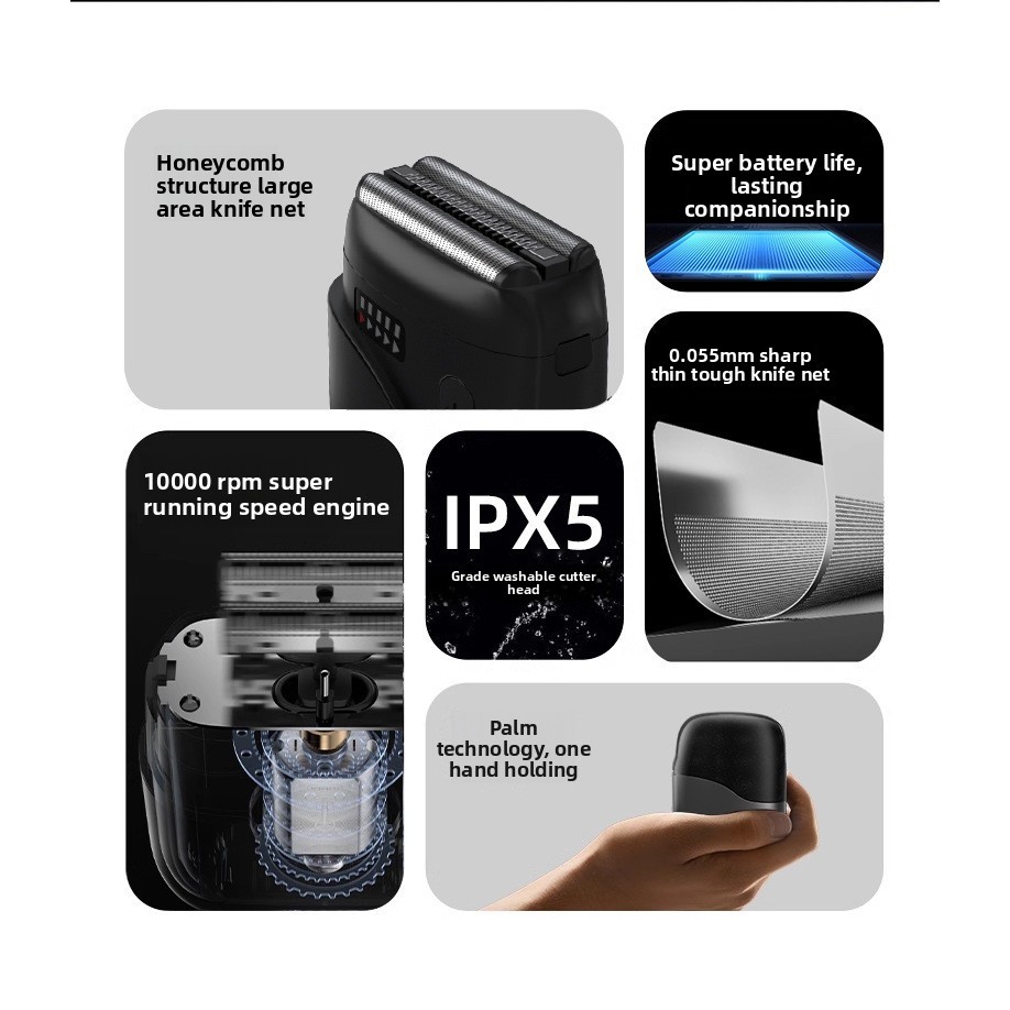 New ultra-thin electric shaver with reciprocating three-blade heads, fully washable and portable