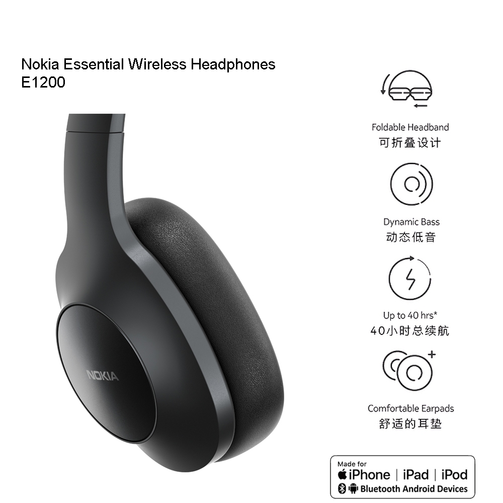 Nokia E1200 (Black) Stereo headphones with Mic for Smartphone/iPhone/PC Laptop/Smart TVs | Wireless Bluetooth Headset | Bluetooth 5.0 | Foldable | Dynamic BASS | Comfortable Earpads | Up to 40 hours*