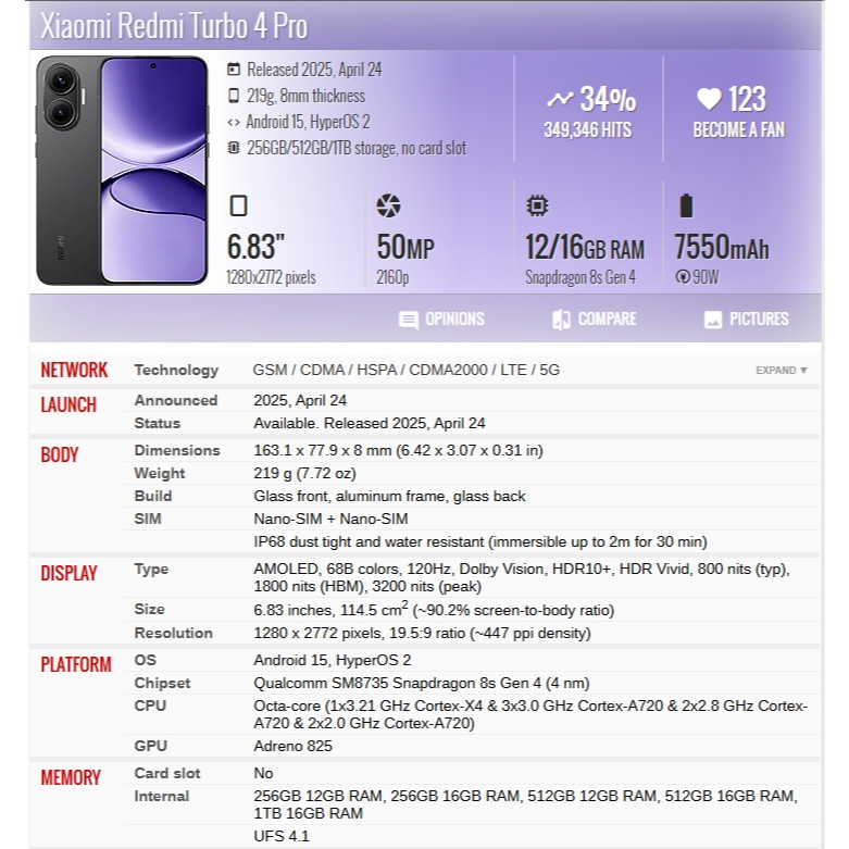 Redmi turbo 4 pro/Snapdragon 8s Gen 4 (4 nm)/6.83 inches/AMOLED, 68B colors, 120Hz/Si/C Li-Ion 7550