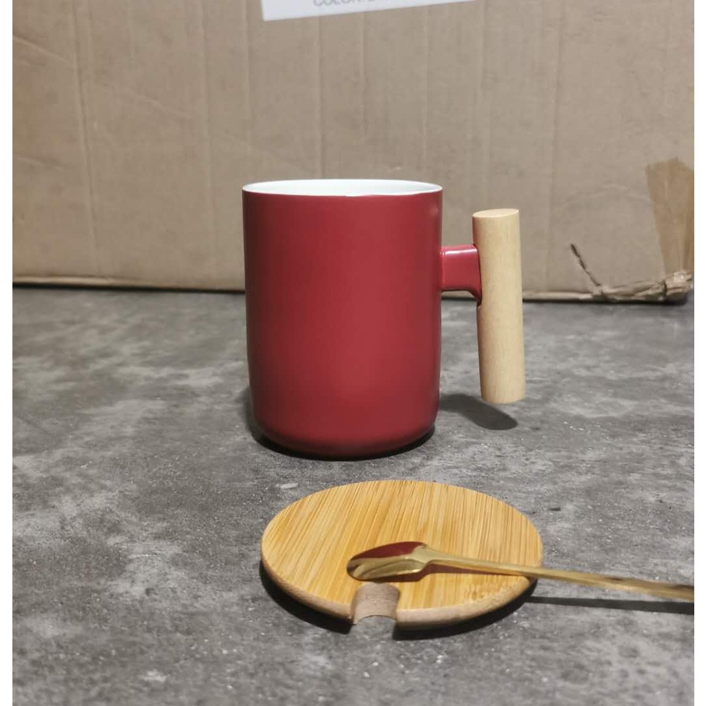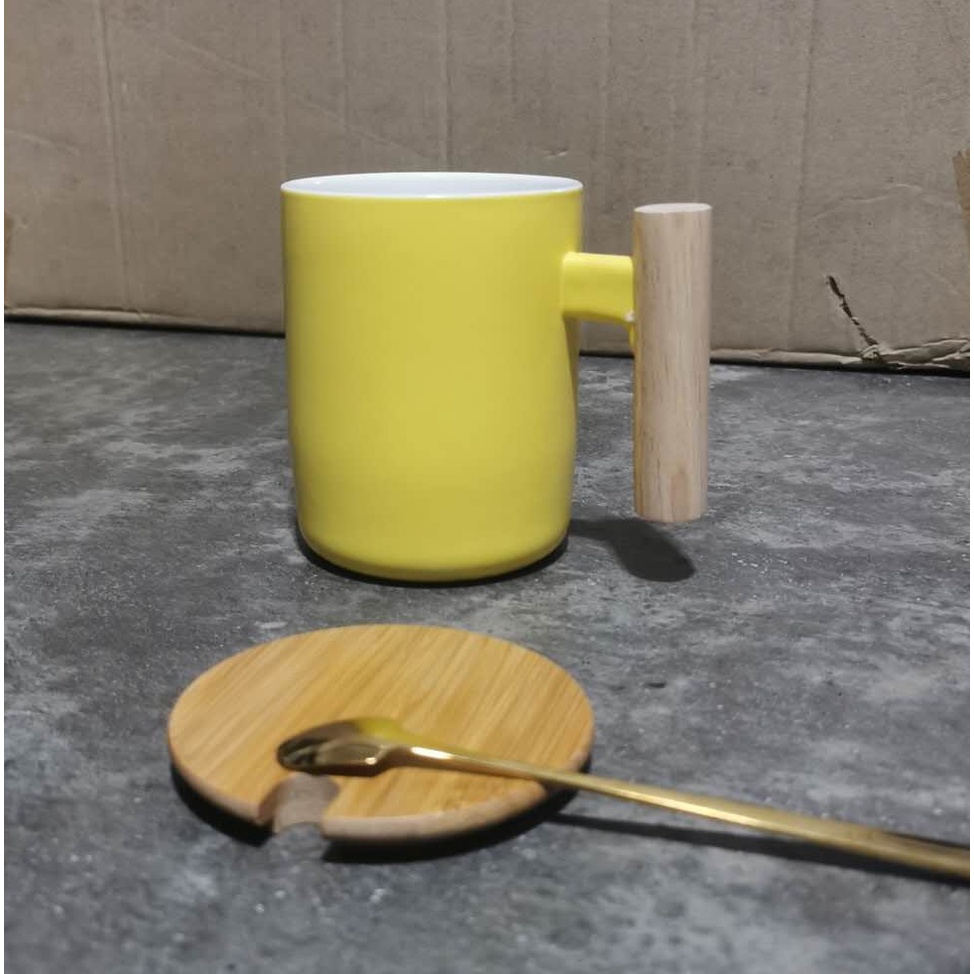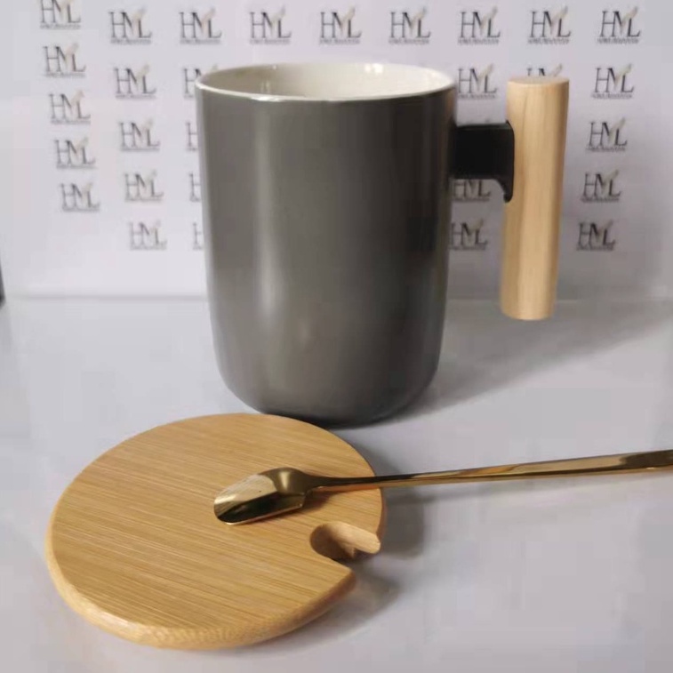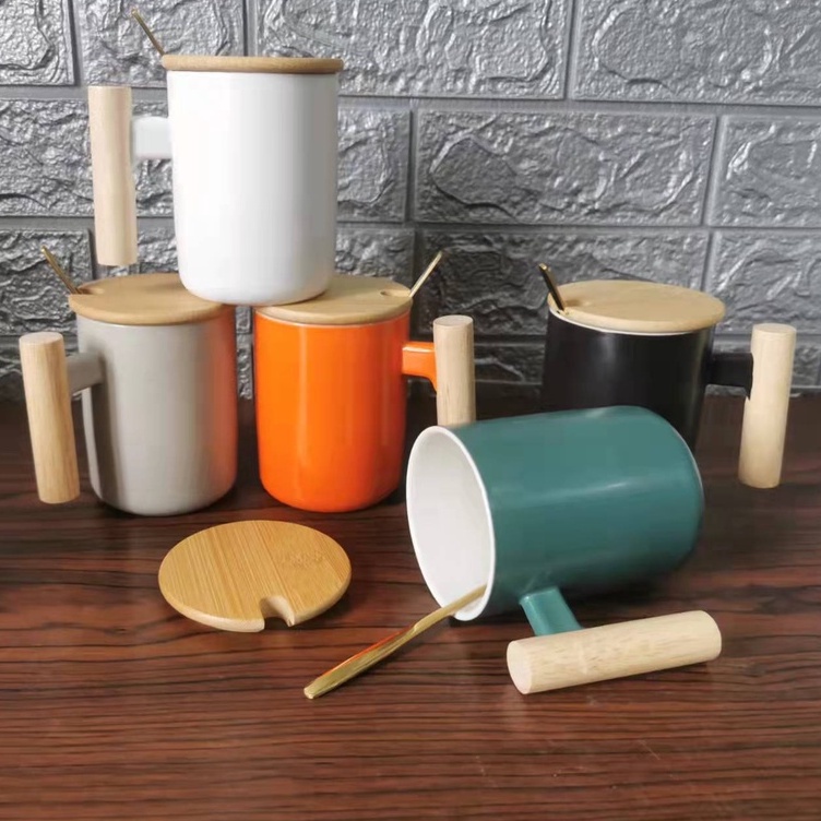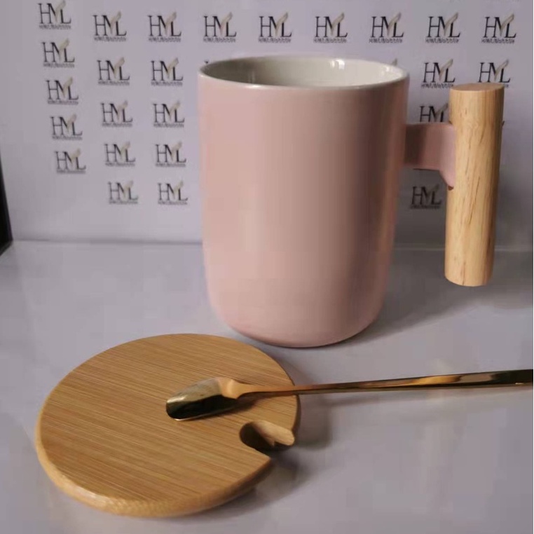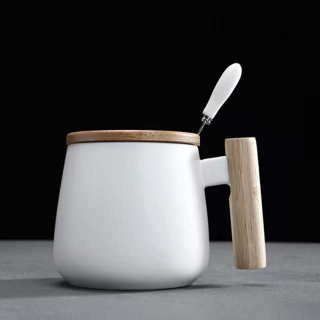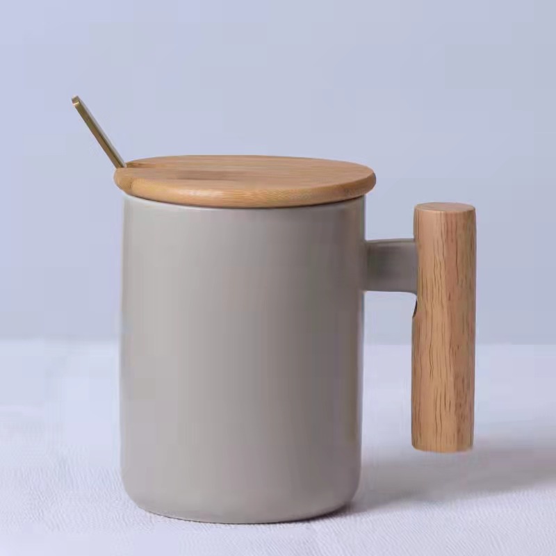 Nordic Minimalist Handmade Ceramic Mug Coffee Cup with Wooden Handle and Cover Lid with FREE Spoon