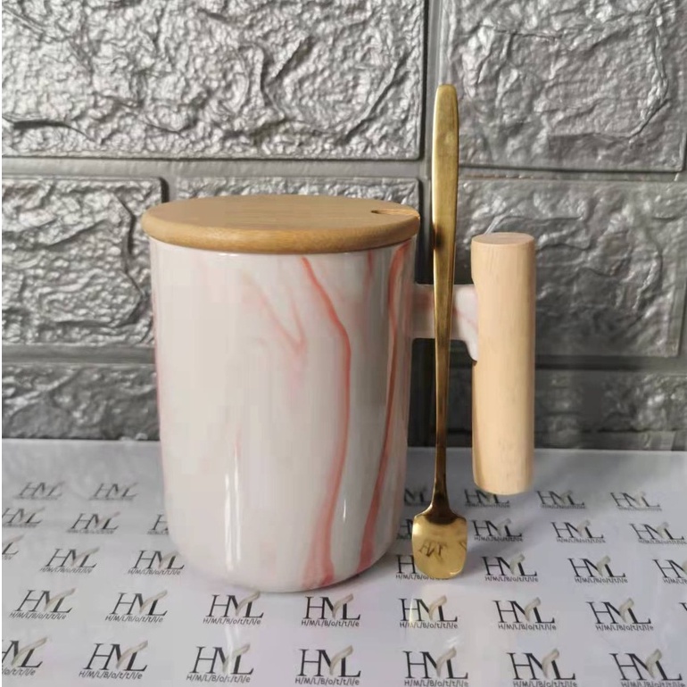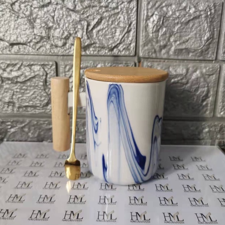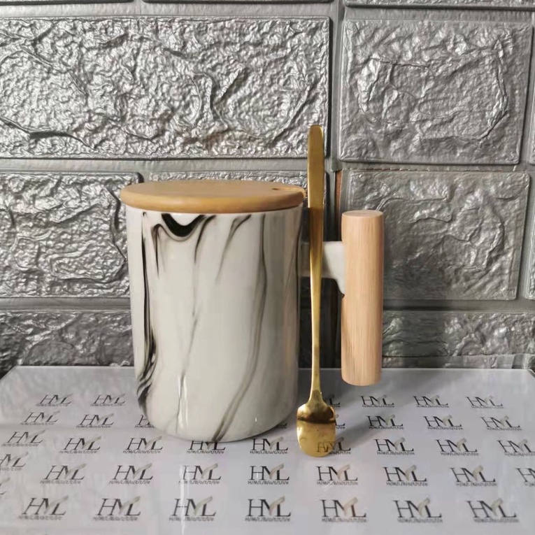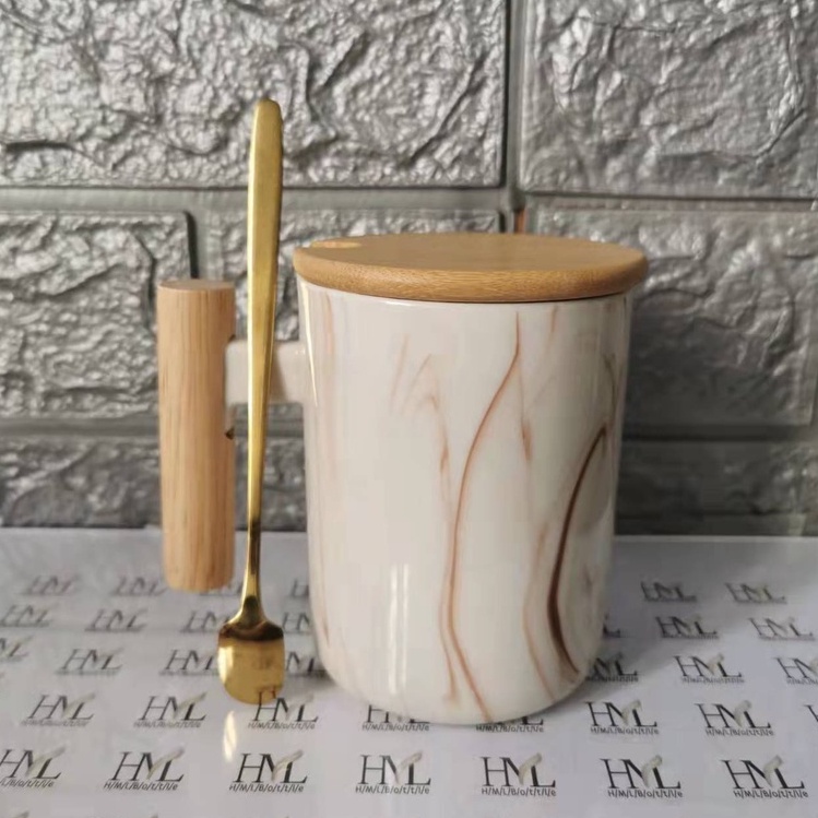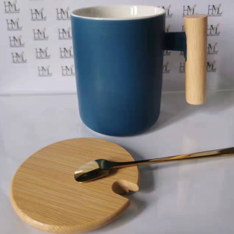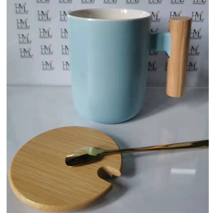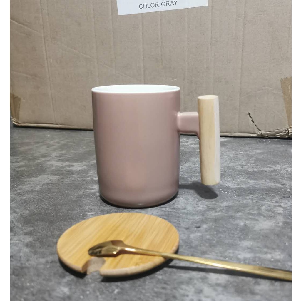 Nordic Minimalist Handmade Ceramic Mug Coffee Cup with Wooden Handle and Cover Lid with FREE Spoon