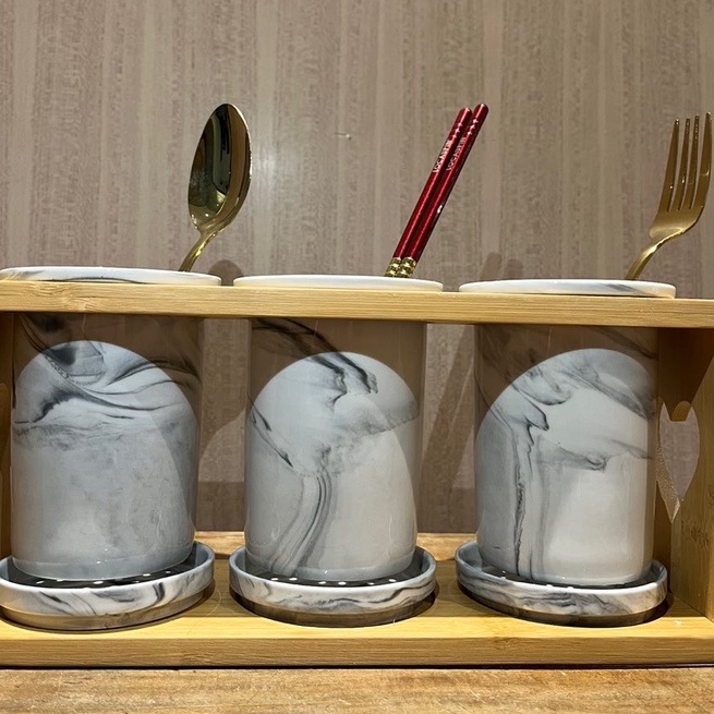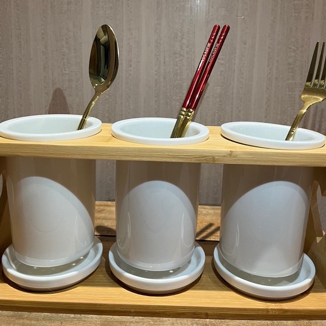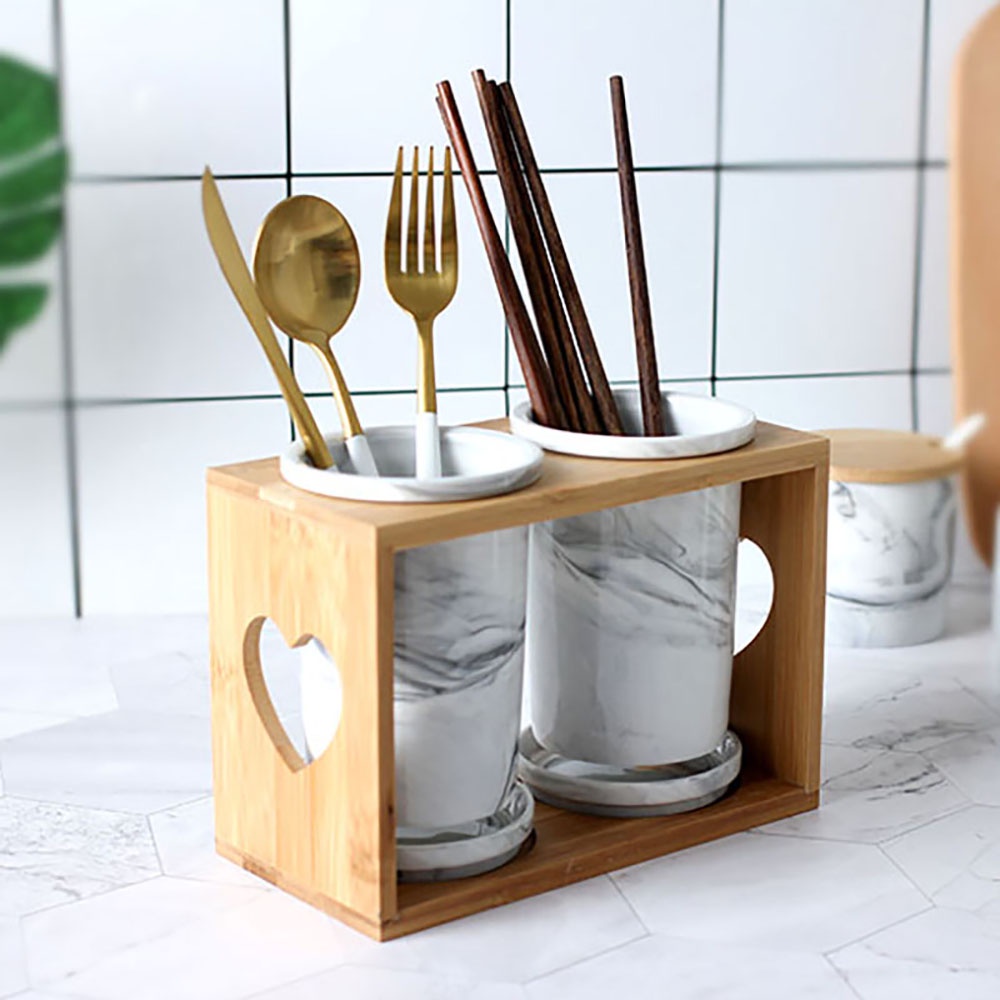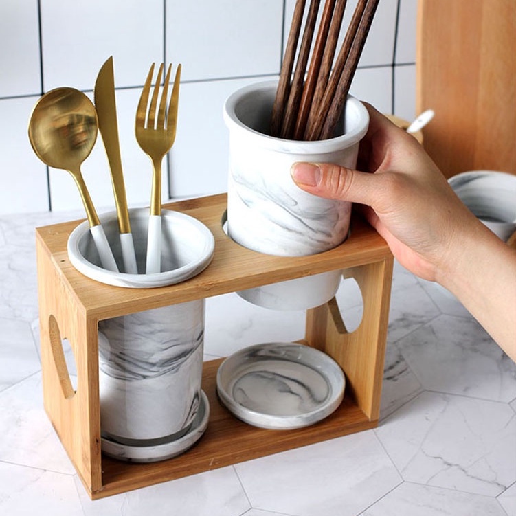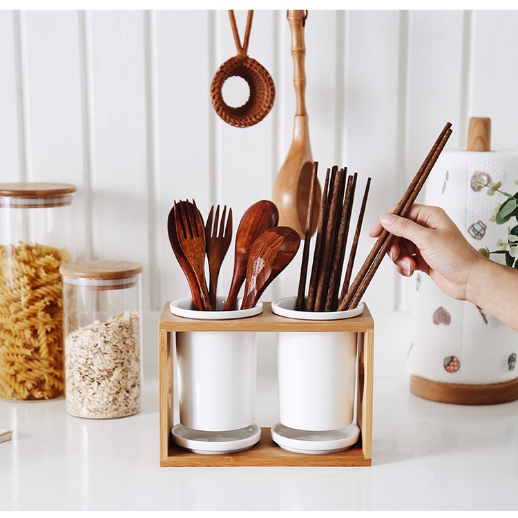 Nordic Porcelain Kitchen Utensil Cutlery Holder Jar Container Bamboo Cage Storage w Drainer