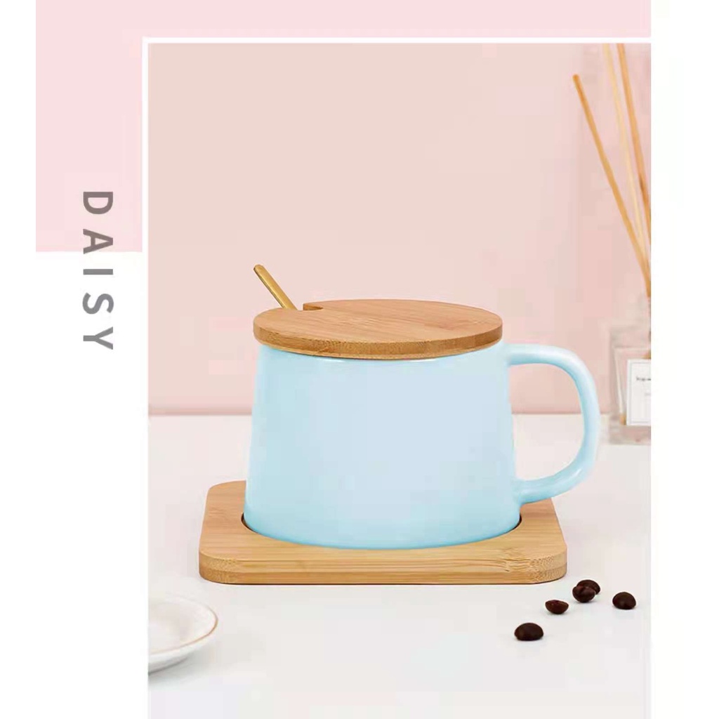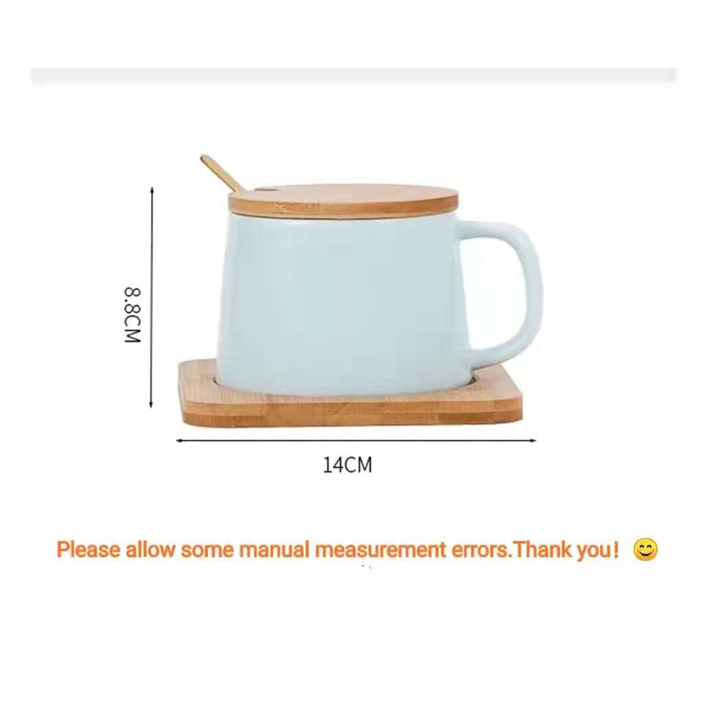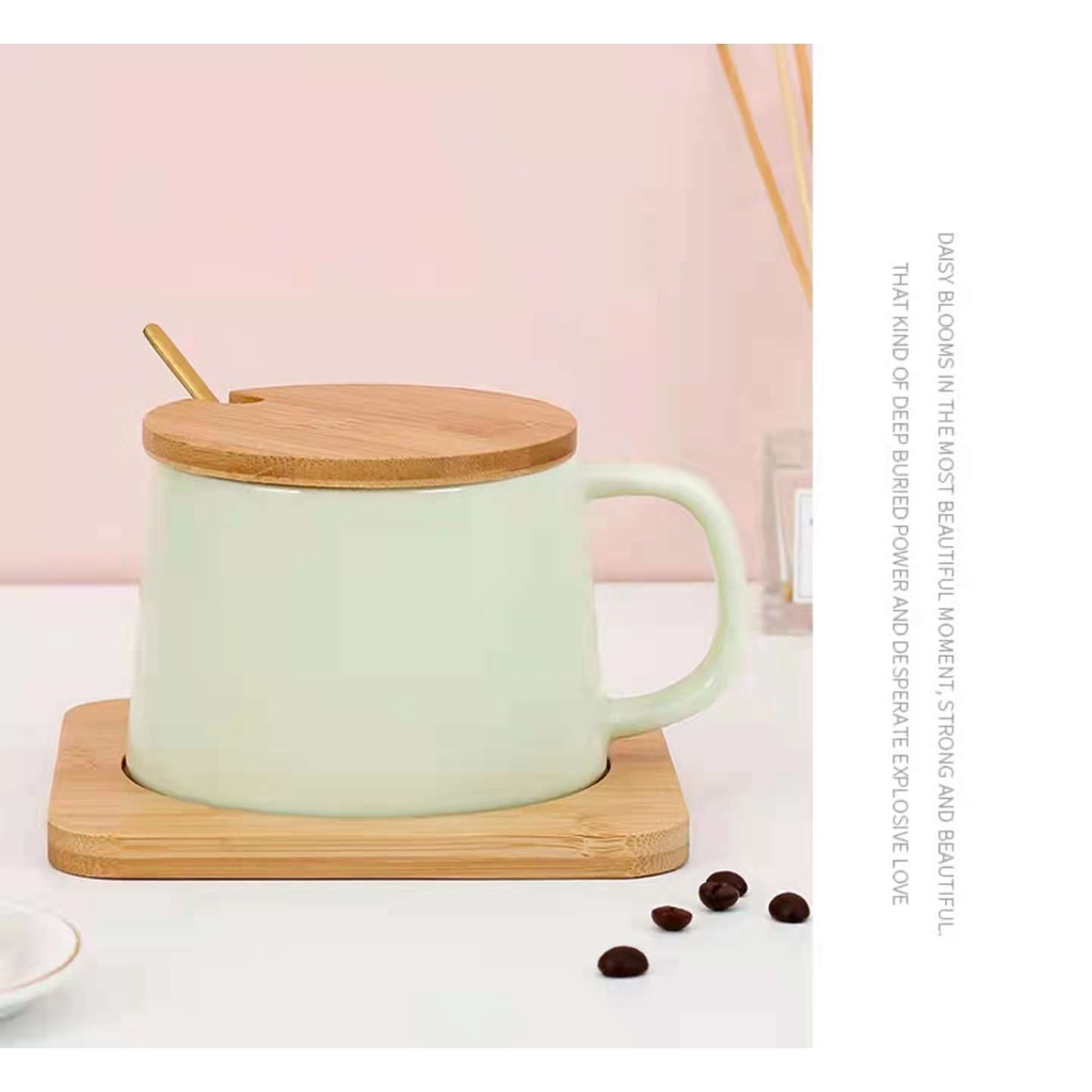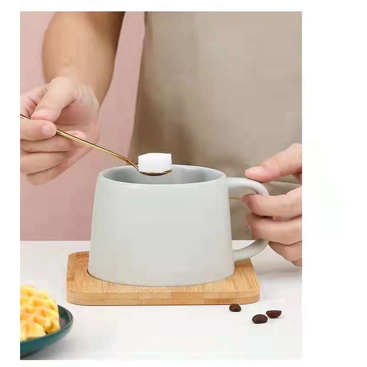 Nordic style na ceramic mug na may hawakan ng kawayan, 1 takip ng kawayan, 1 gintong stirring spoon