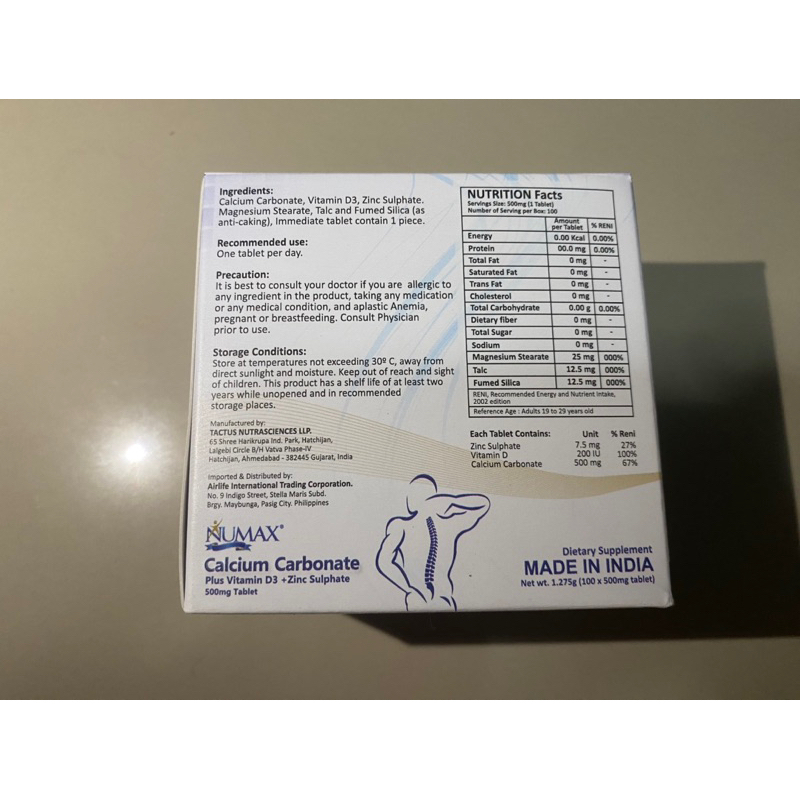 Numax Calcium Carbonate 500mg with Vitamin D3 & Zinc 100pcs