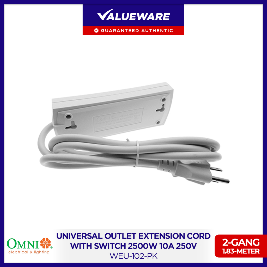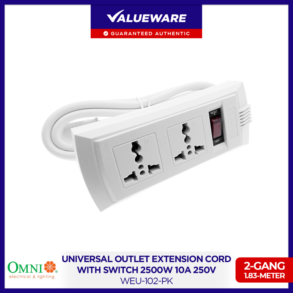 OMNI Universal Outlet Extension Cord with Switch 2-Gang 1.83-Meter Wire 2500W 10A 250V | WEU-102-PK