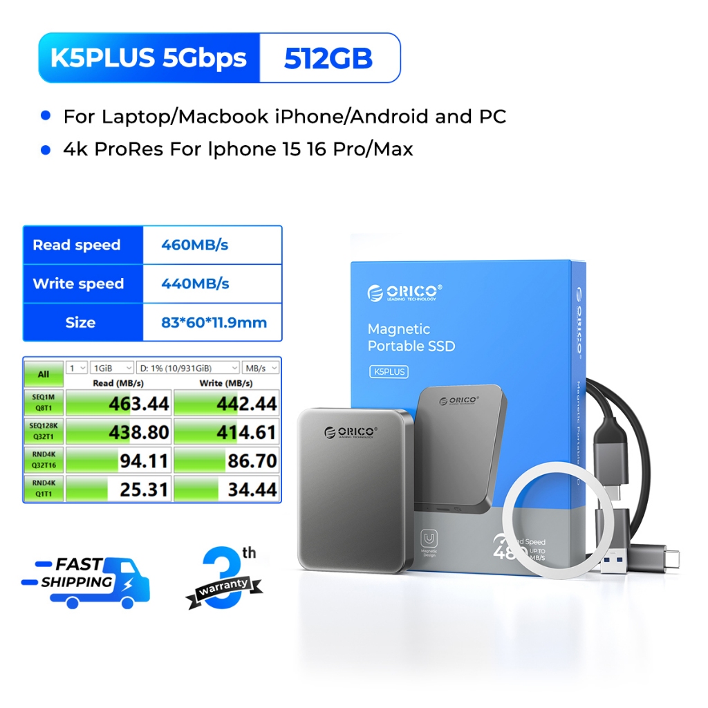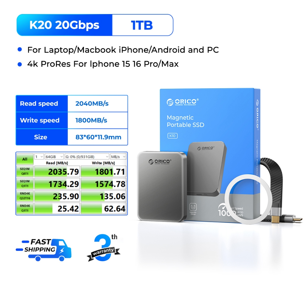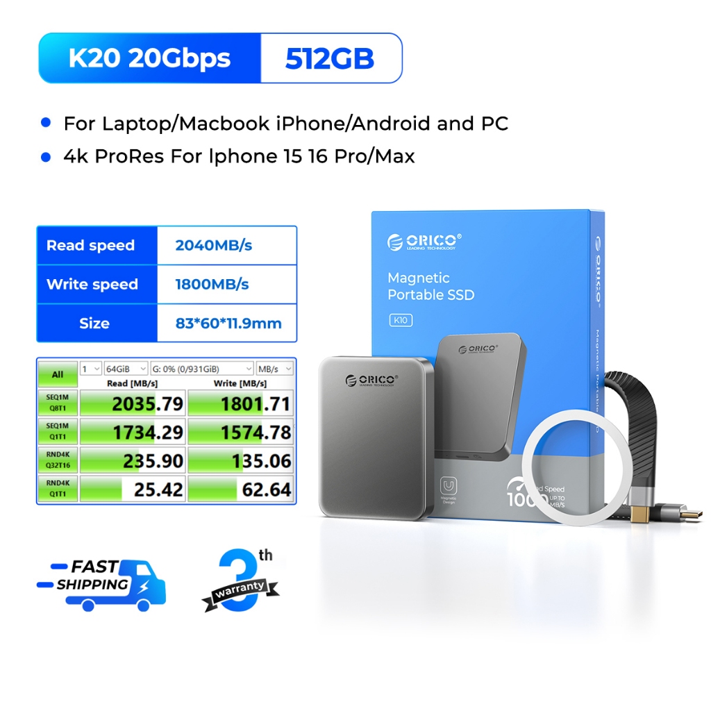 ORICO Magnetic External SSD 512GB 1TB 2TB 4K ProRes Video Storage Portable SSD for Phone (K20)