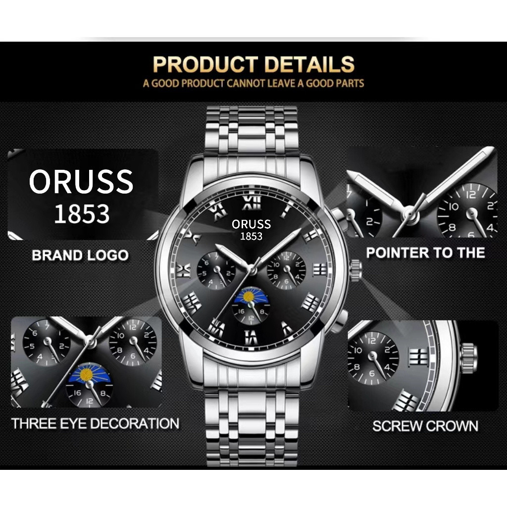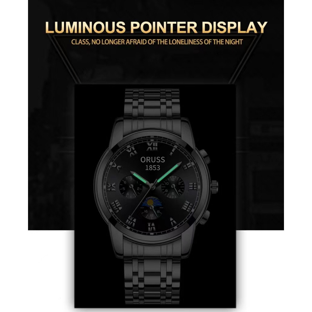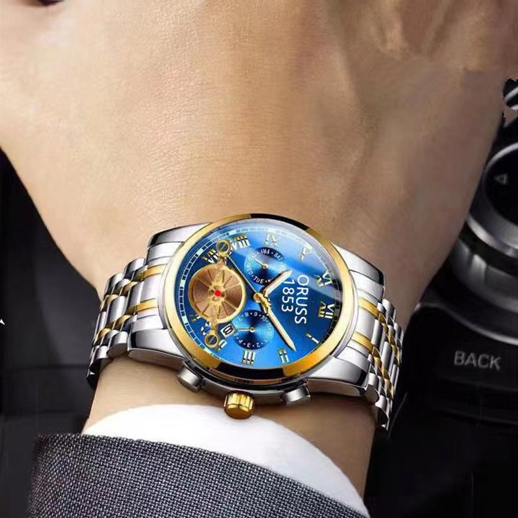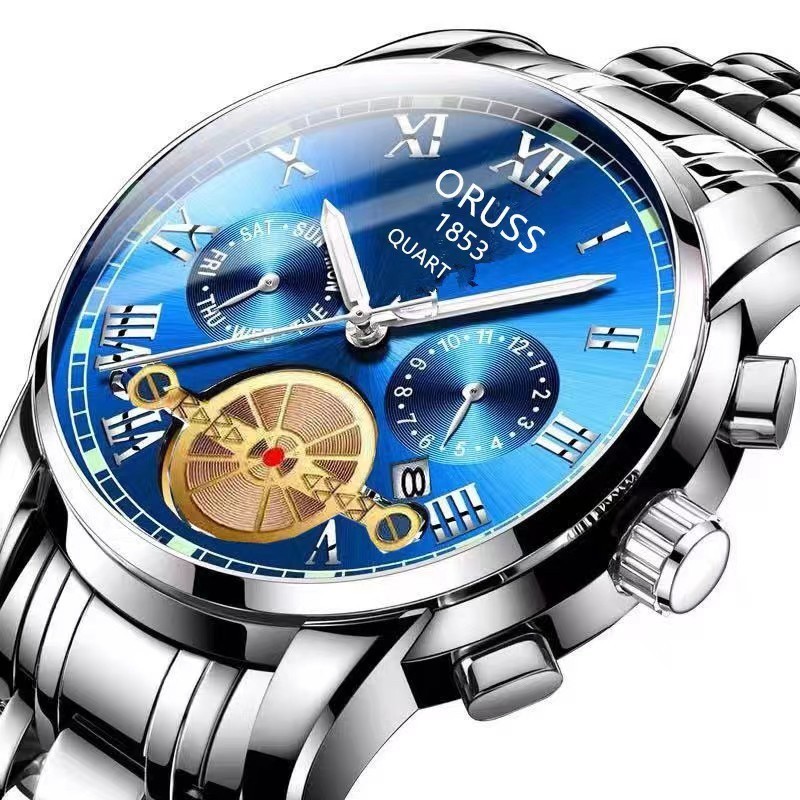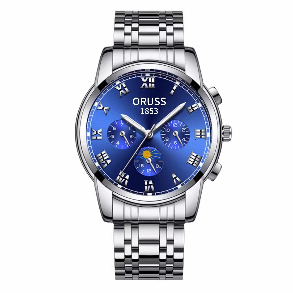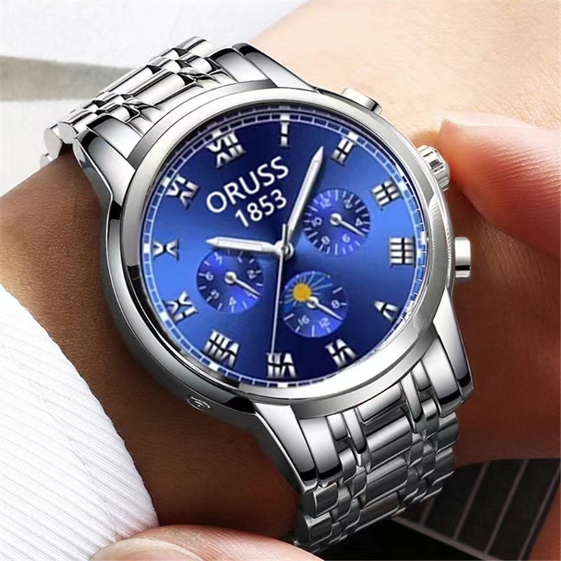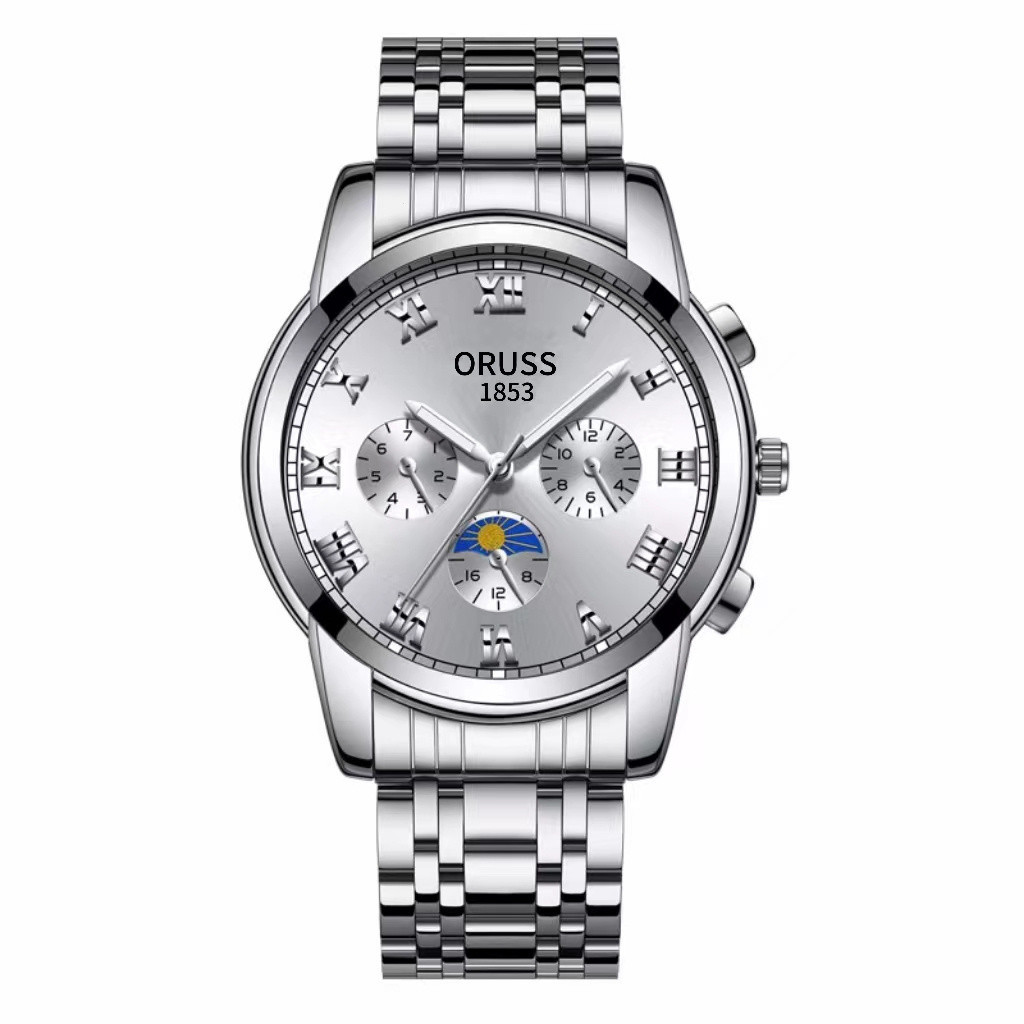ORUSS Original Fashion Three-Eyed Luxury Stainless Steel Business Waterproof Men's Watch Silver Luminous Calendar Swiss Men Korean Automatic Quartz Wrist Watch For Men