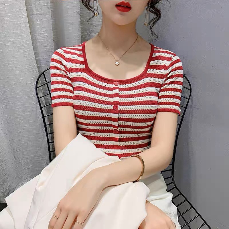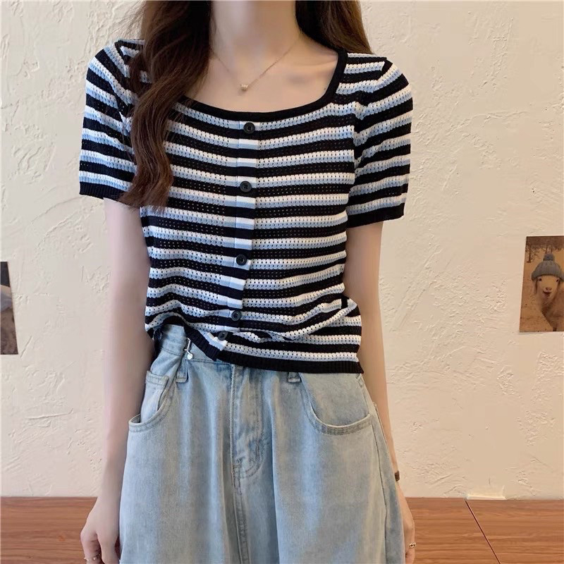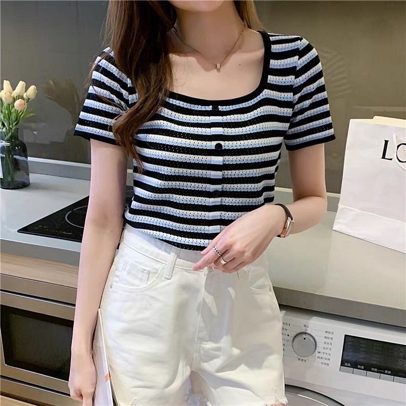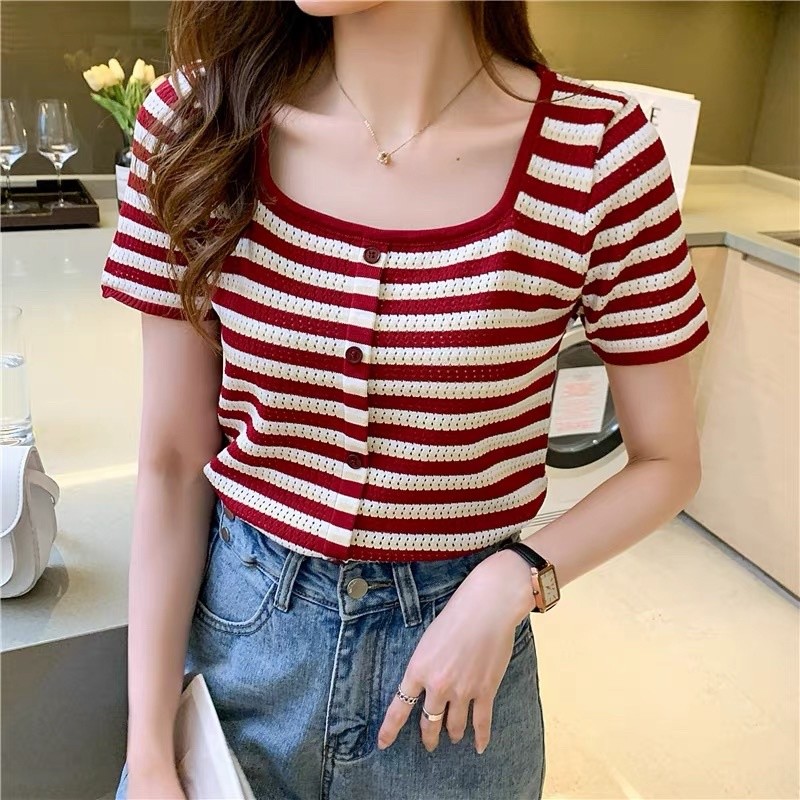 Korean'LN(ac]Women Fashion Square#h]Neck.T#Knitted]o.Top#m.Blouse