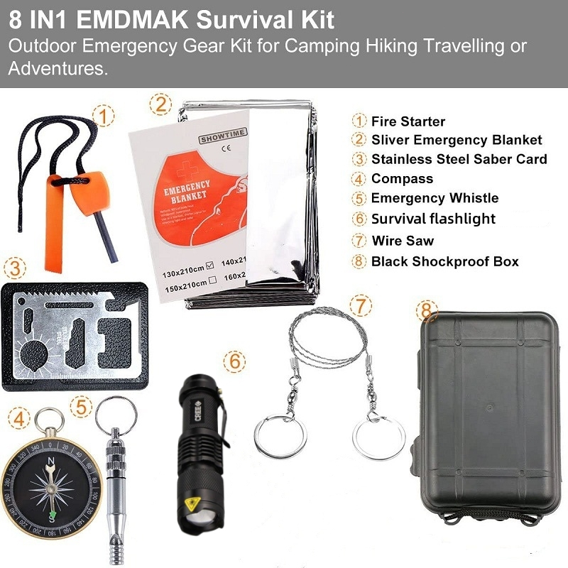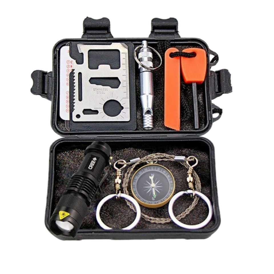 Outdoor camping emergency equipment flashlight compass flint self rescue kit set of 8 pieces