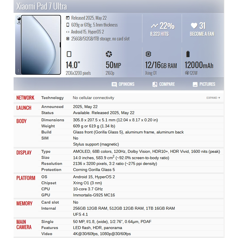 Xiaomi Pad 7 Ultra/14.0 inches/AMOLED, 68B colors, 120Hz/Xring O1 (3 nm) /Android 15, HyperOS 2