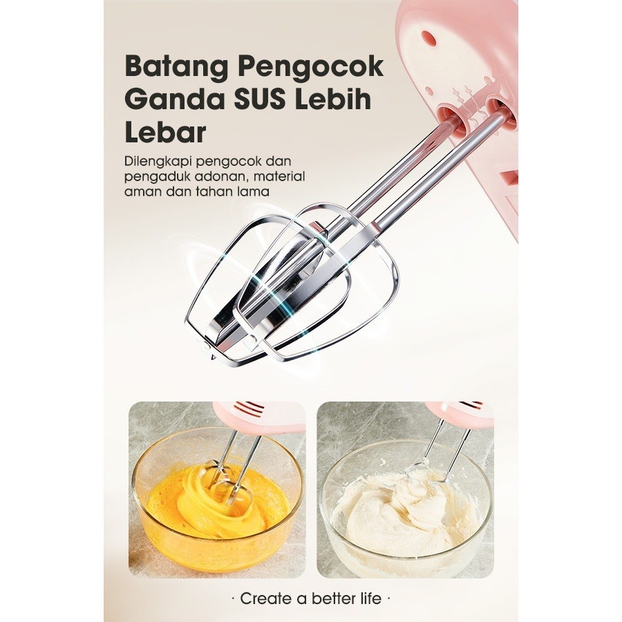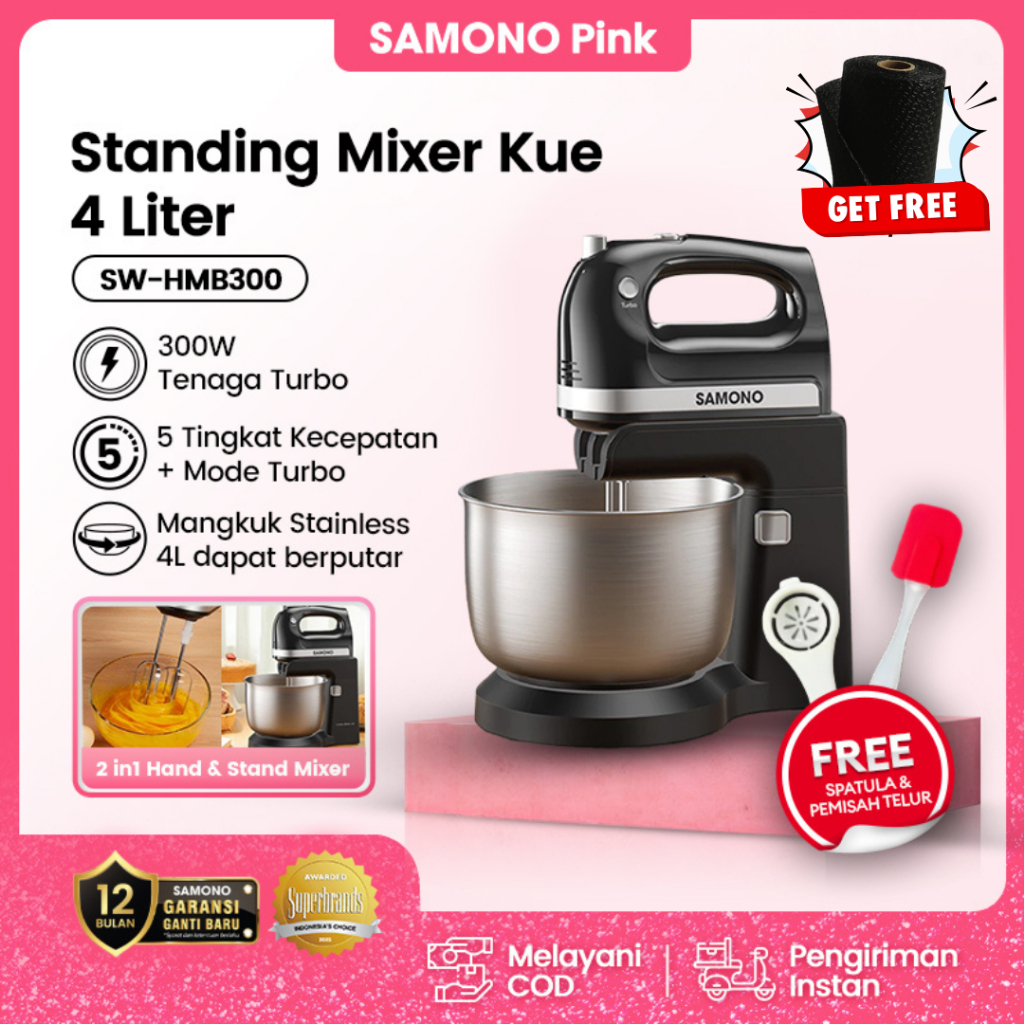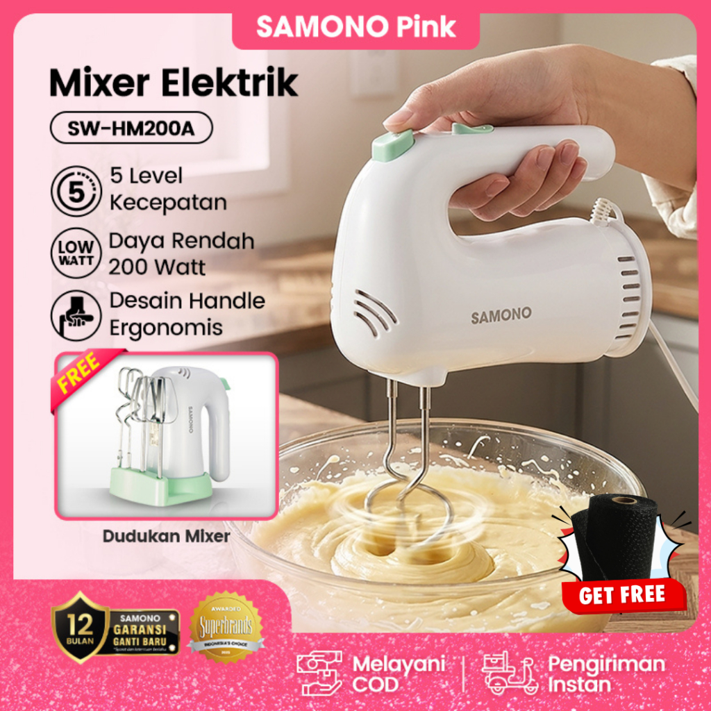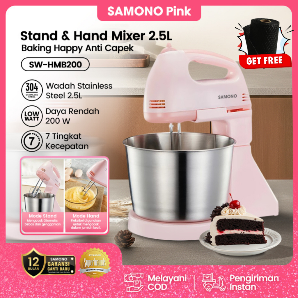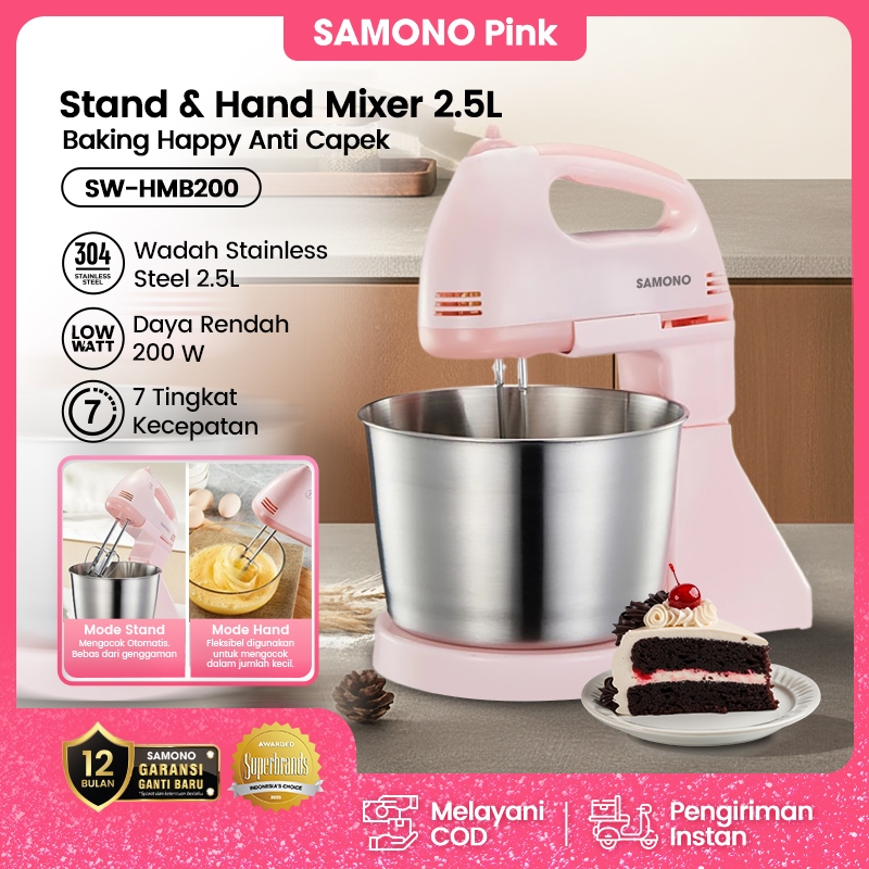 SAMONO Stand Hand Mixer Pink 2.5 Liter SW-HMB200 2in1 Handheld Bench Mixer 200W 7 Speed Levels Stainless Steel Bowl Whisk SUS Food Grade for Cake Bread Whipped Cream Baking Home Practical Strong Multifunctional Mixer Mixer for Baking