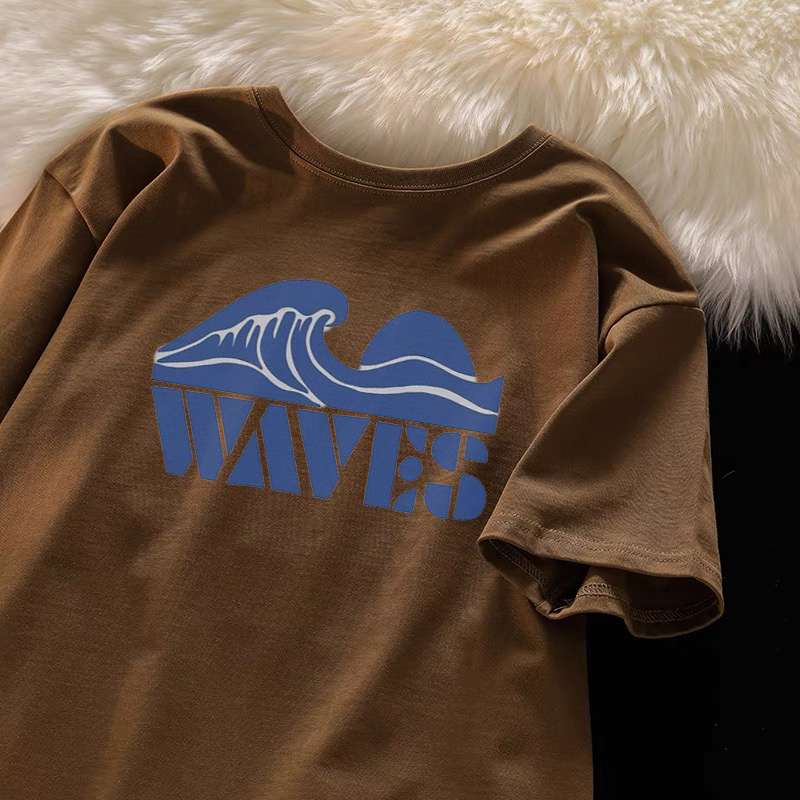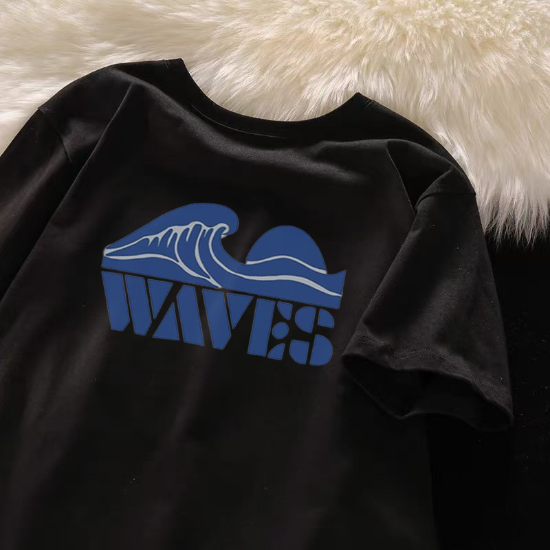 Korean style loose round neck cool blue wave letter print pure cotton T-shirt for woman