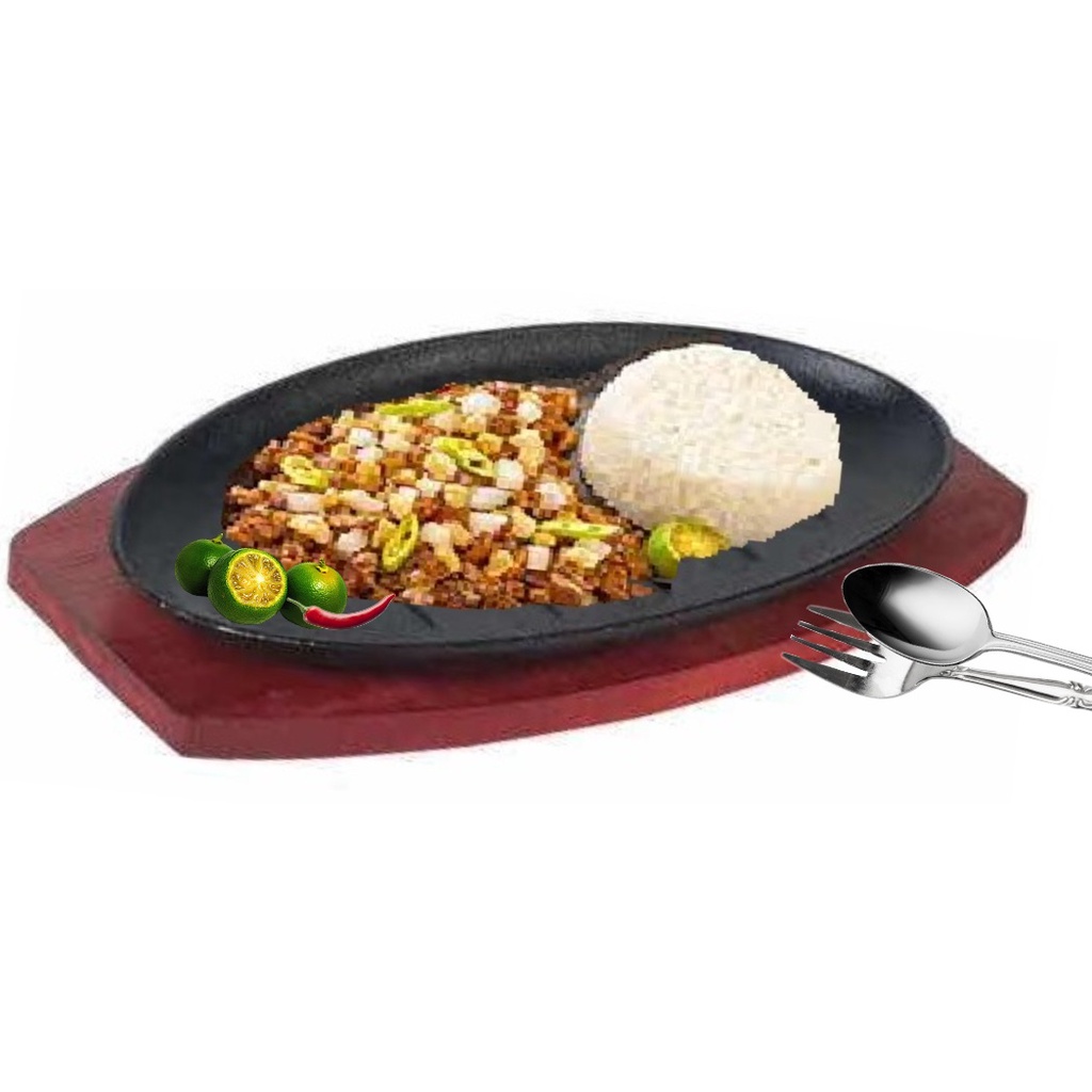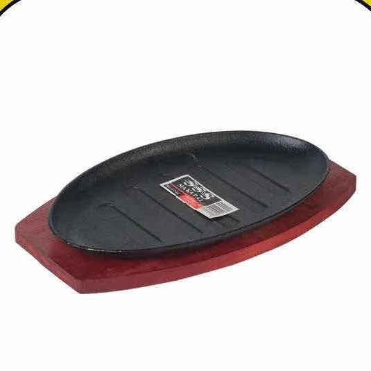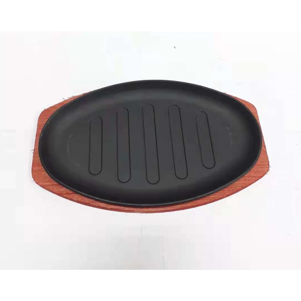 Oval Sizzling Plate with Wood Holder Base Cast Iron 9302