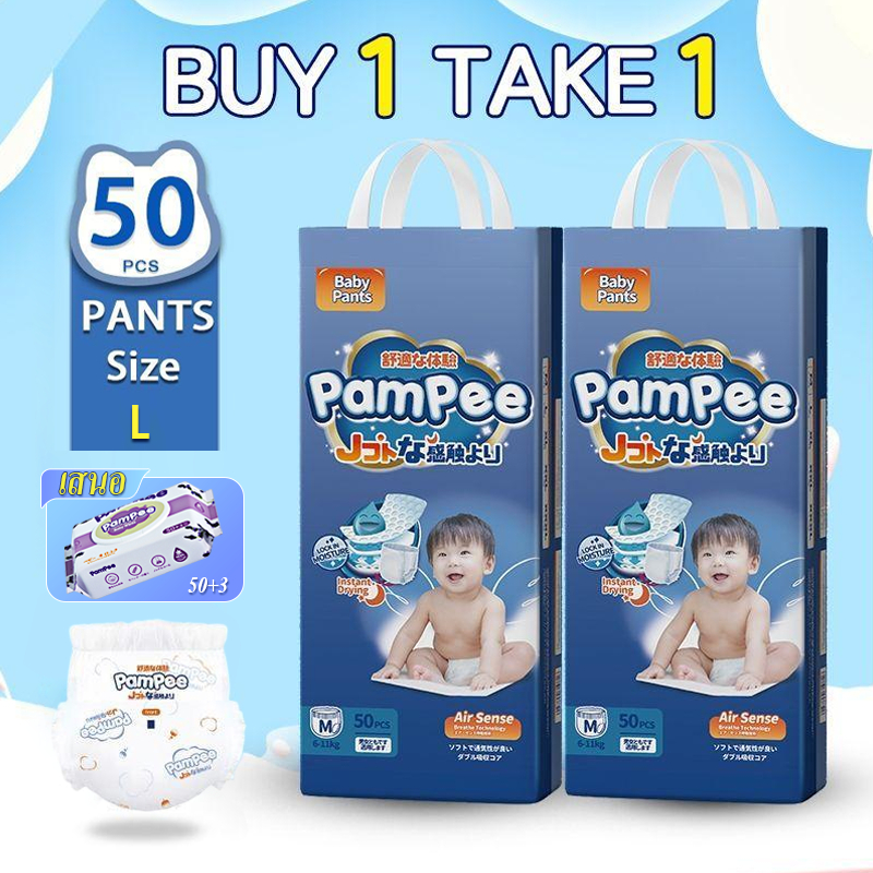 PAMPEE Buy 1 Take 2 Diaper Baby Pants Free Baby Wipes 50+3pcs Size S-2XL Comfort Fit Pull-up Pants