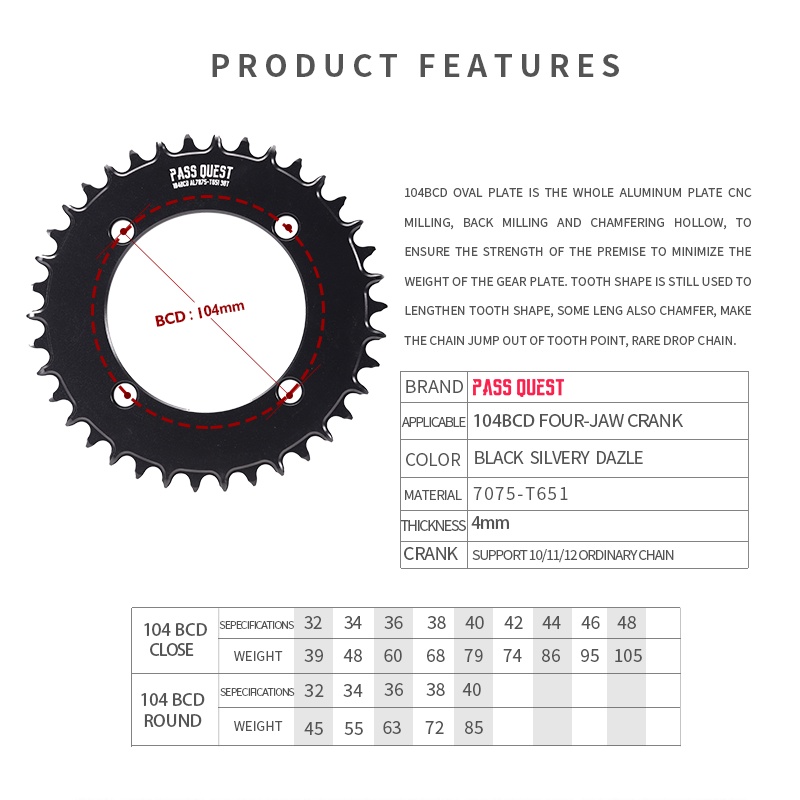 PASS QUEST 104bcd Chainring 32t 34t 36t 38t 40t round narrow wide chainring MTB crankset Tooth