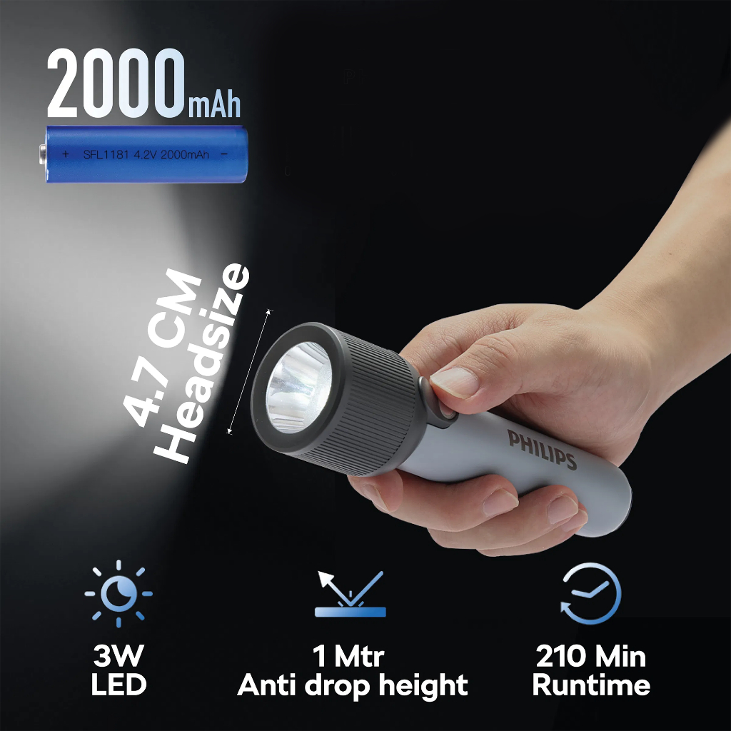 PHILIPS 3W Rechargeable LED Flashlight Torch | 400 Lumens | 150m Range Up to 12hrs Use