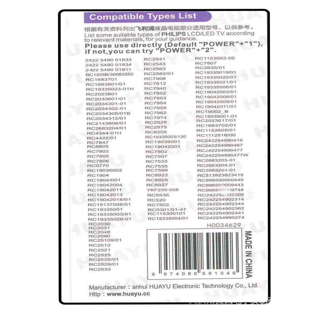 HUAYU NANO TECH UNIVERSAL TV REMOTE 2020 version RM-L1285 L1285V