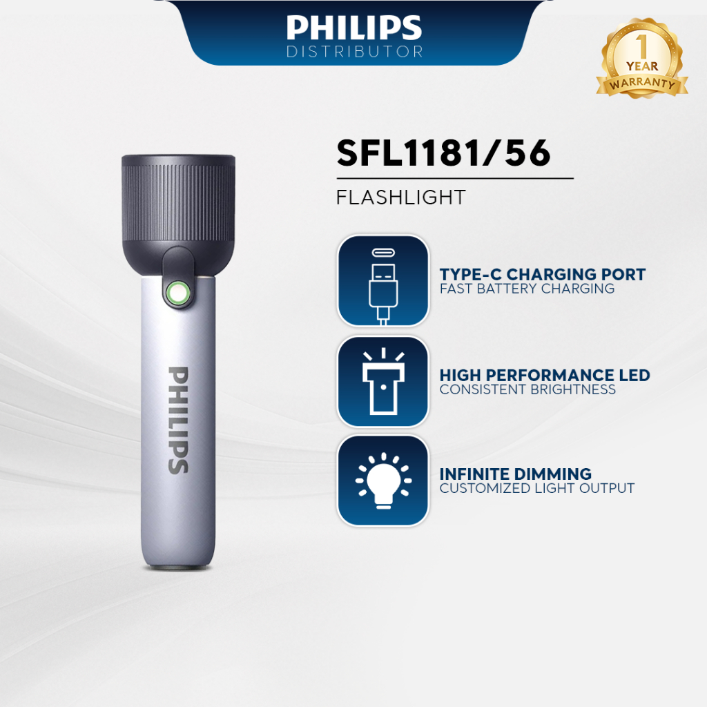 PHILIPS Flashlight SFL1181-56 Original - Rechargeable, Type C Charging, 3W LED, 3 Lighting Modes