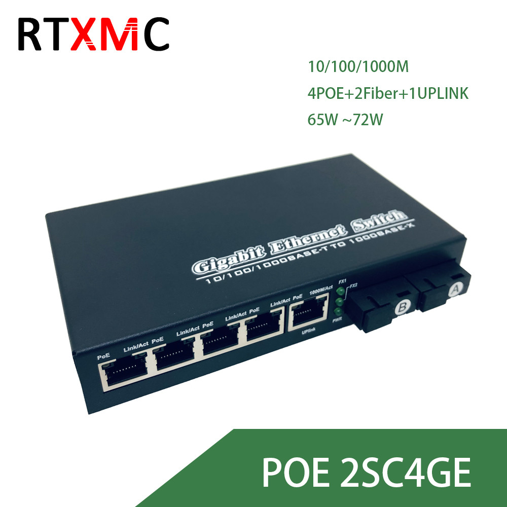 POE Gigabit 2 Optical 4 Electrical Single Mode Fiber Optic Transceiver POE Powered Fiber Optic Switch
