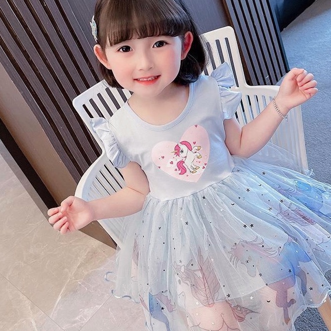 PONY Girls' Long Tulle Princess Dress Ruffled Short Sleeves Pony Chest Printing in Pink/Blue 1-7 YO