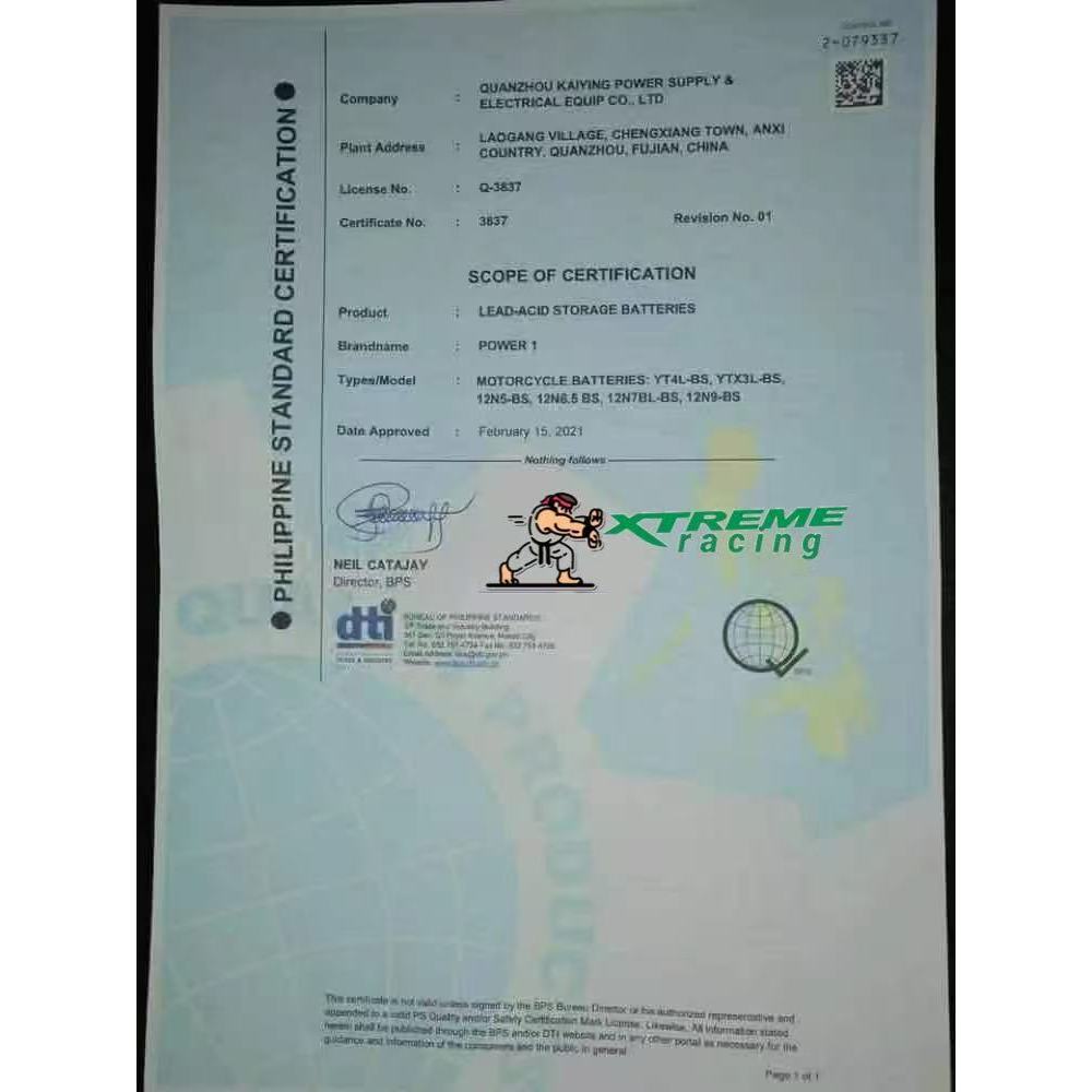 POWER 1 BATTERY YT4L-BS For XRM 110/125 Wave125 Xrm Fi 3nity Wave100 Mio i 125 Soul i 125 Fino/Mio M