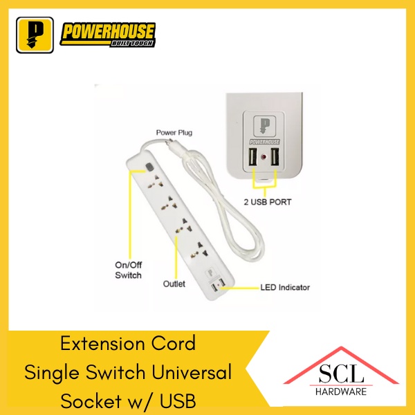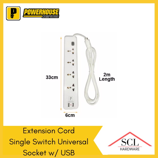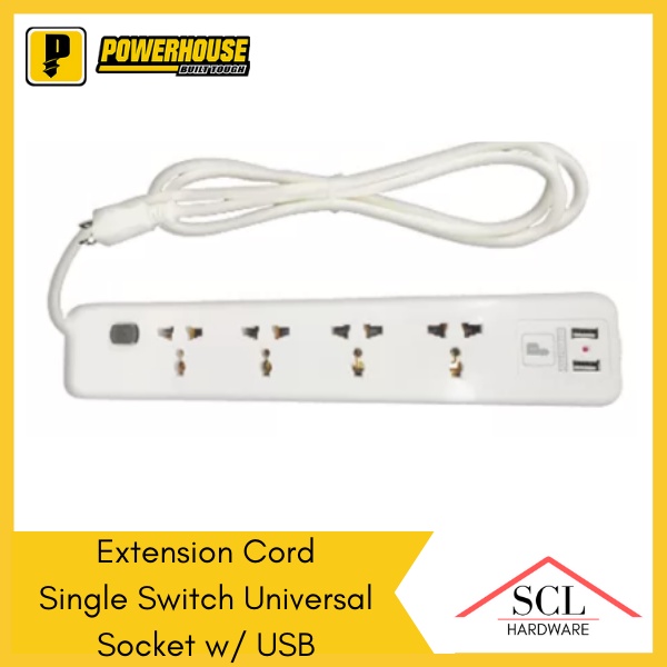 POWERHOUSE Electric Extension Cord with Single Switch USB Universal Outlet Socket PHEC-005U