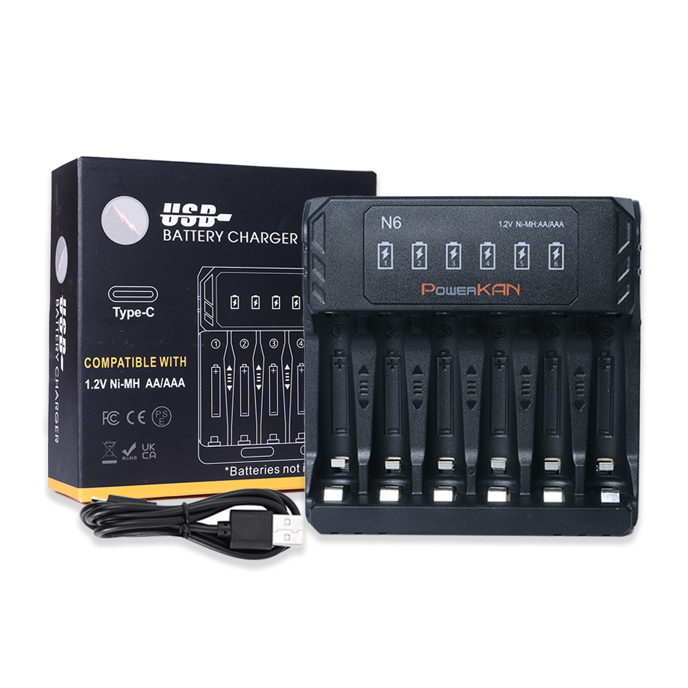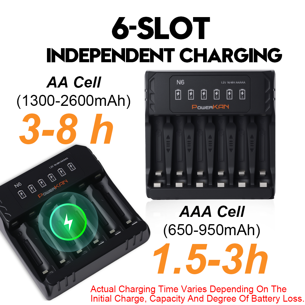PowerKAN AA AAA charger, LED display battery status, 6 independent high-speed charging slots, suitable for 1.2V NiMH 5 7 R03 R6 batteries