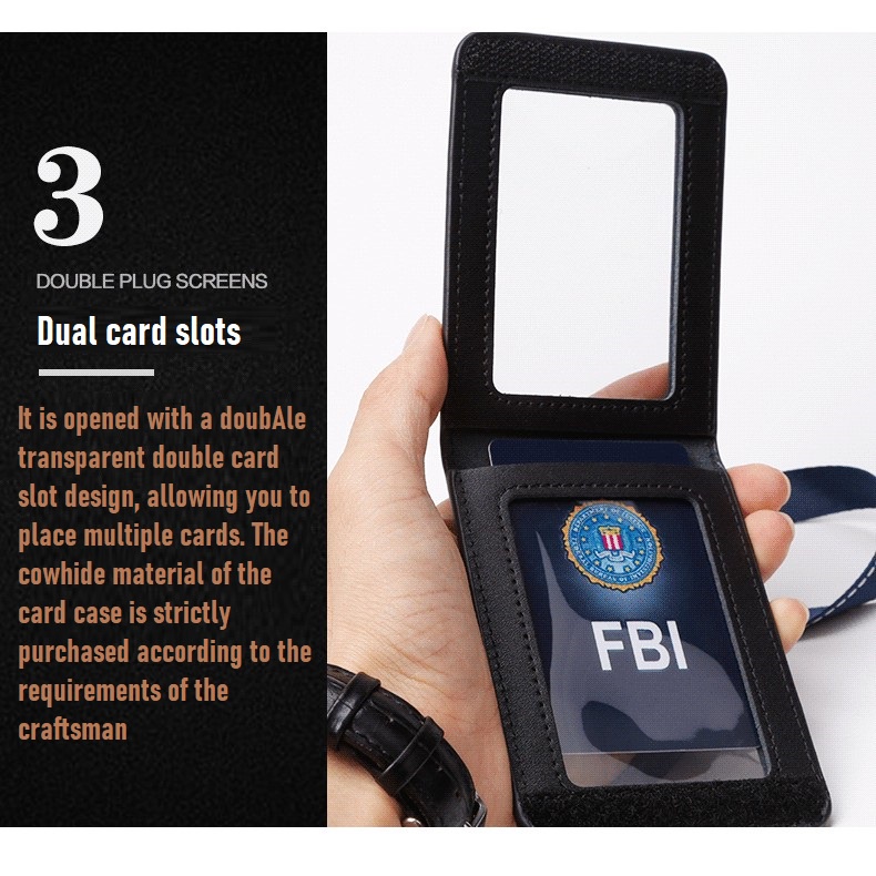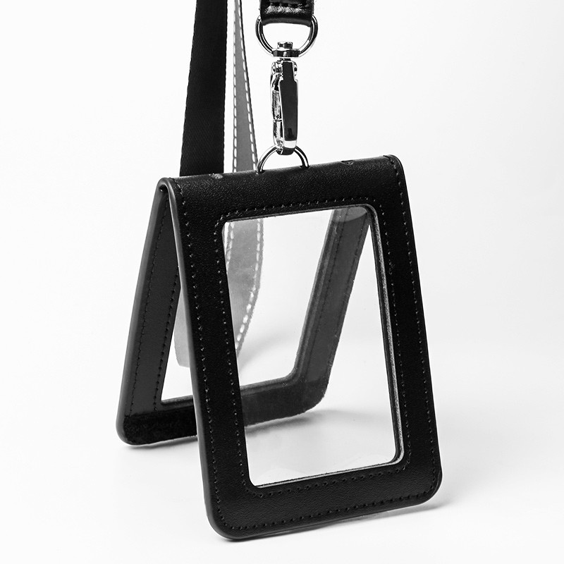 PU Leather ID Card Holder, Four Sides Transparent Leather Badge Holder Lanyard ID Card Office Card Holder