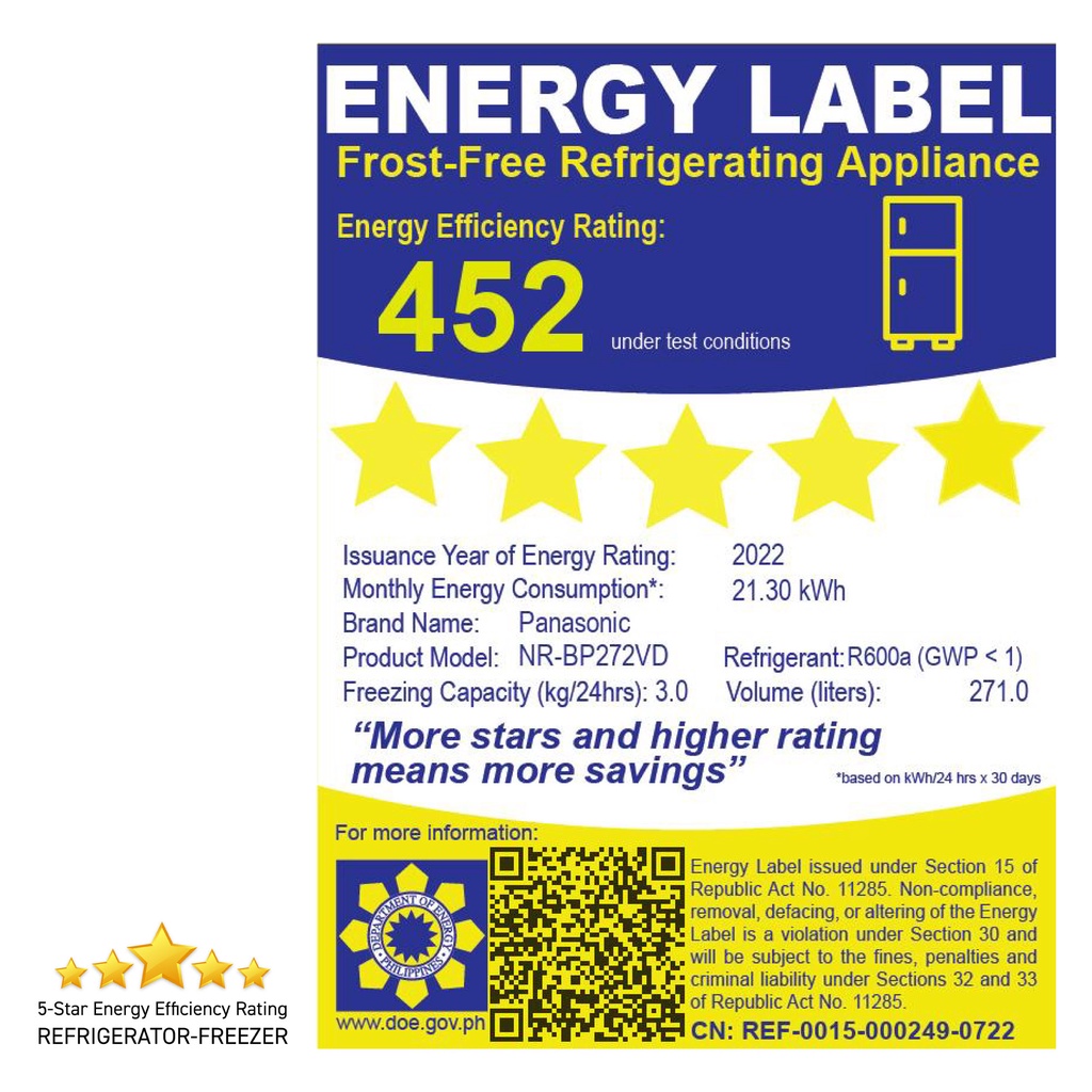 Panasonic NR-BP272VD 9.5 cu.ft Deluxe Prime No-Frost Inverter Two Door Top Freezer Refrigerator