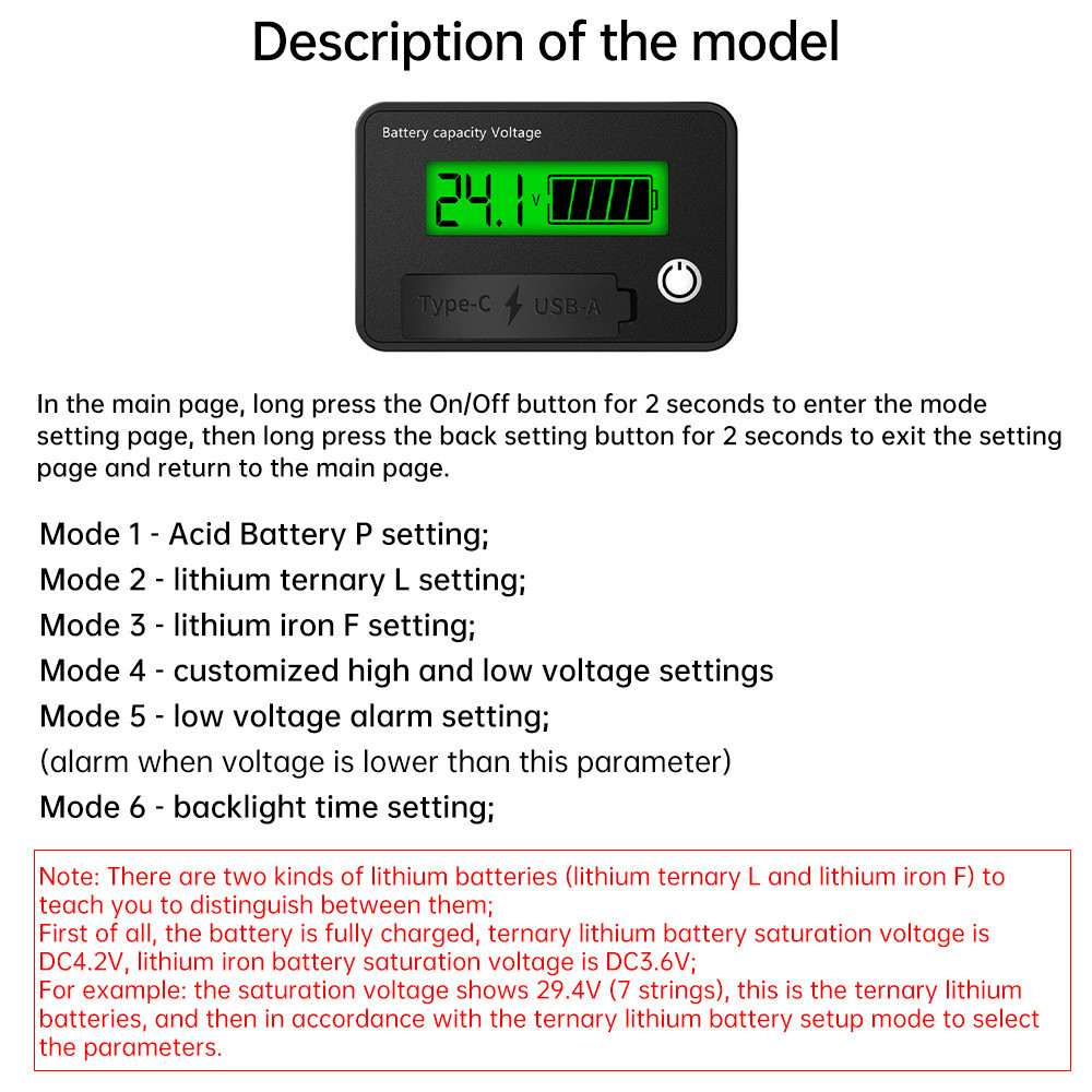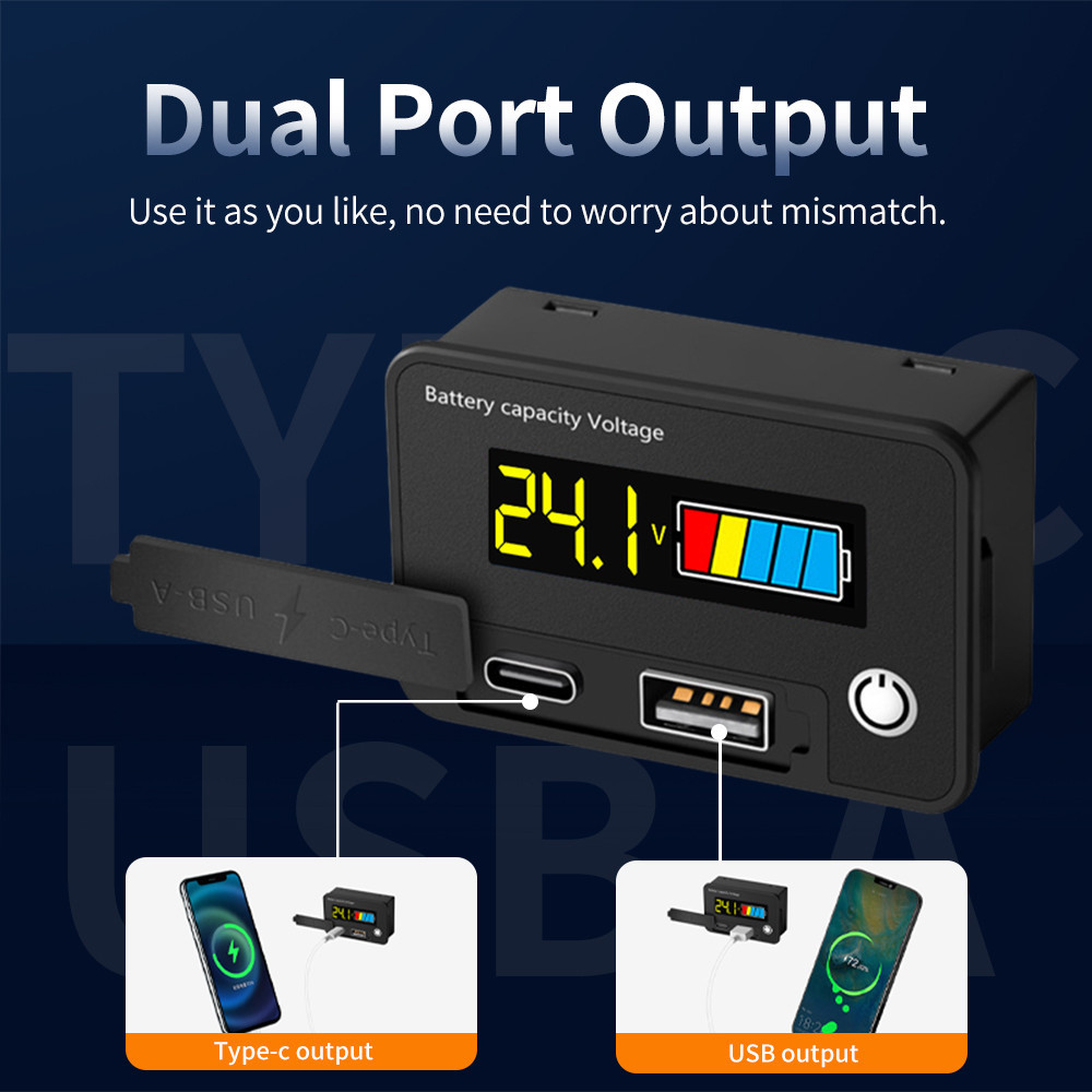 Pcbfun 6140B LCD Digital Voltage Meter Acid Battery Lithium Battery Level Indicator Reverse Connection Protection USB+Tpye-C Output DC 8~30V