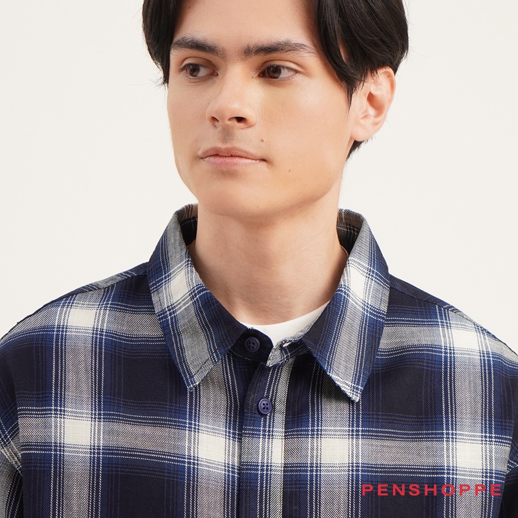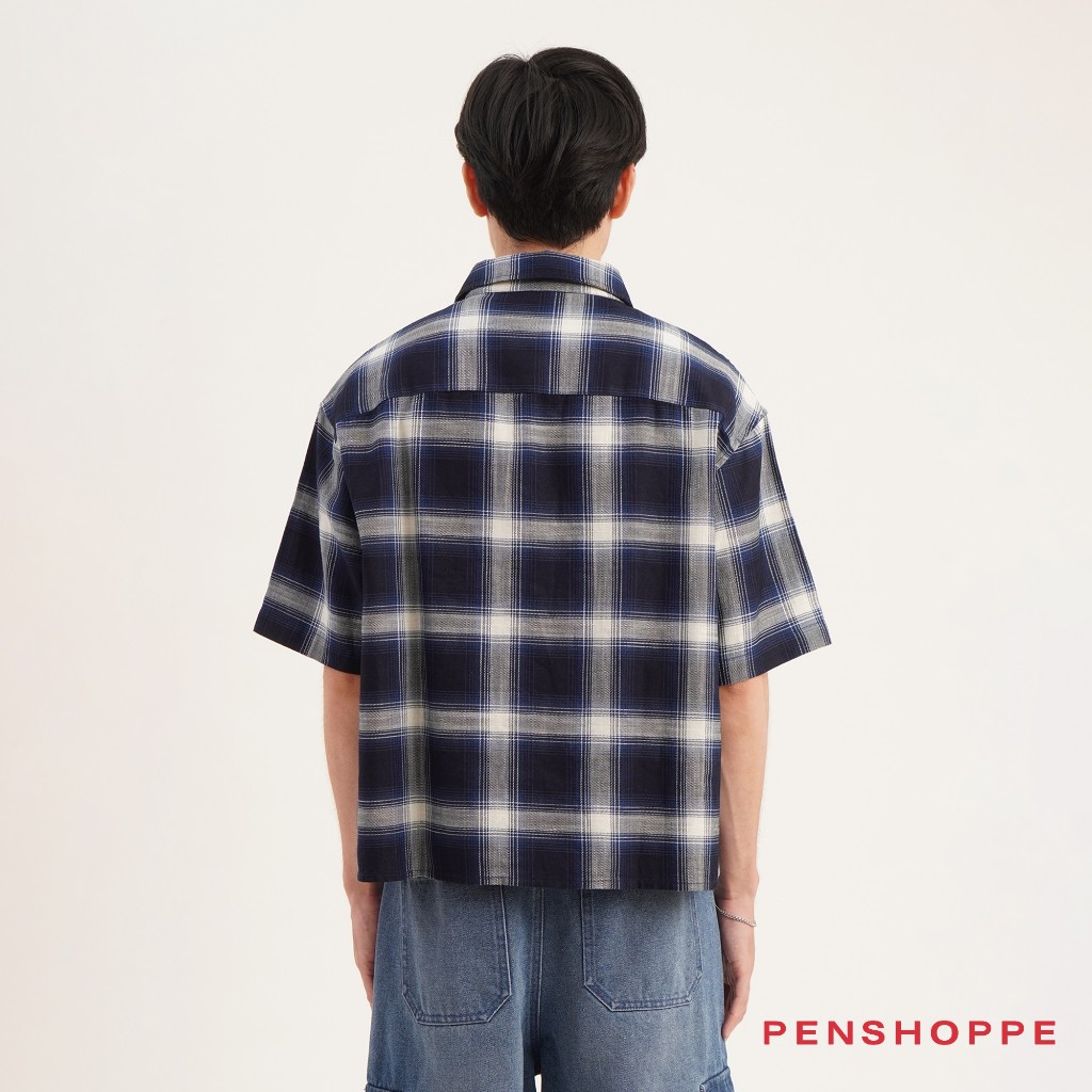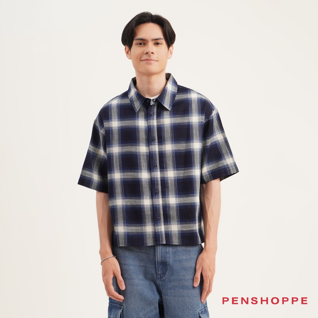 Penshoppe Boxy Fit Plaid Short Sleeves Shirt For Men (Navy Blue)