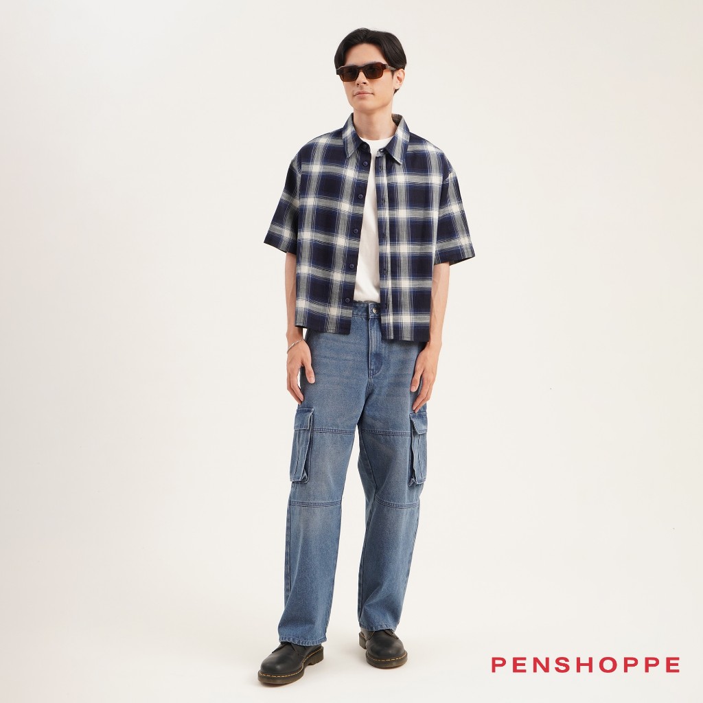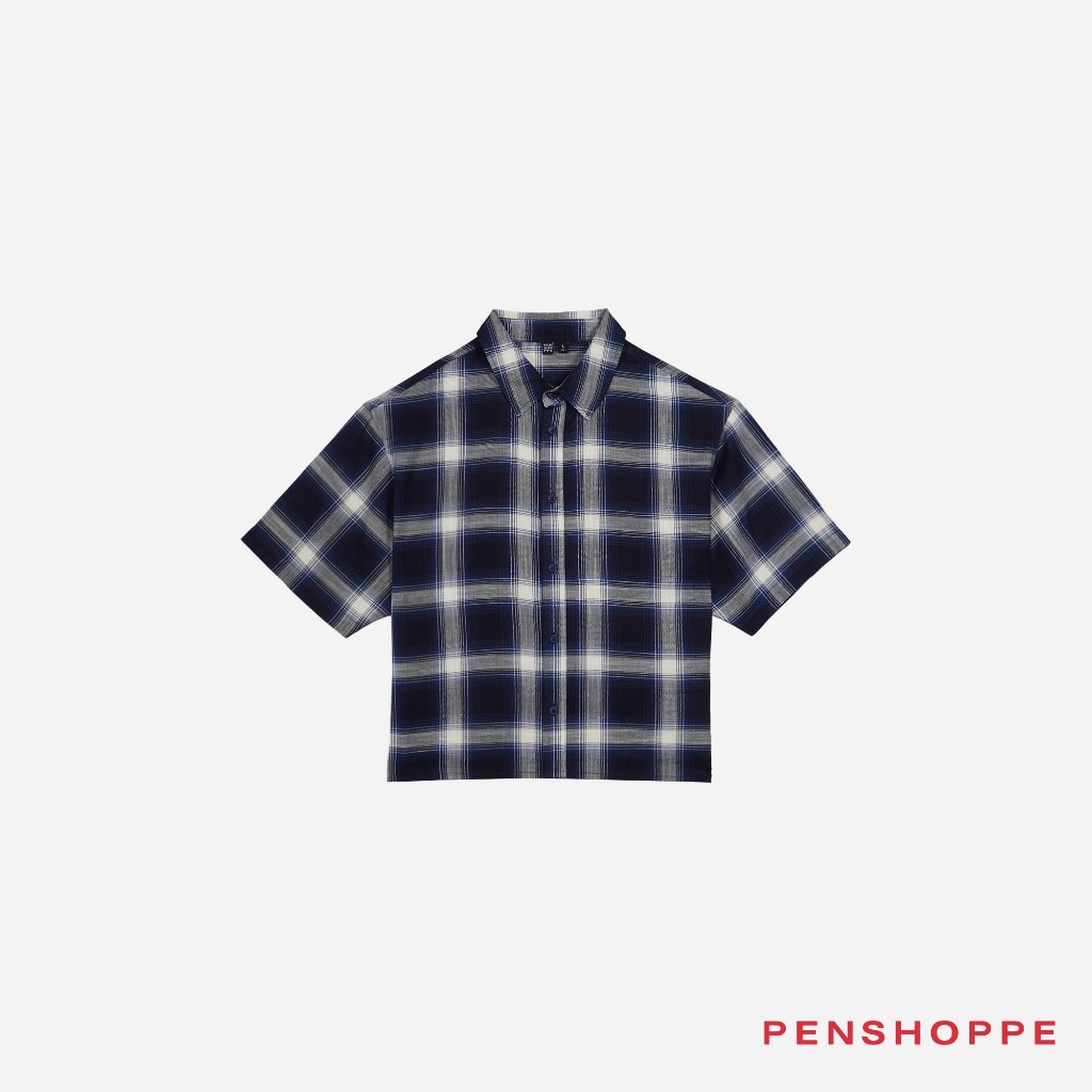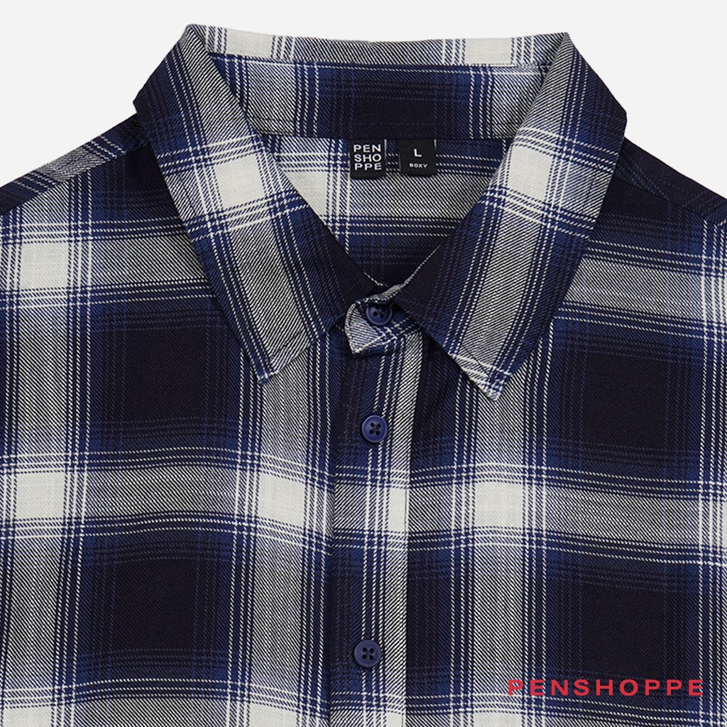 Penshoppe Boxy Fit Plaid Short Sleeves Shirt For Men (Navy Blue)