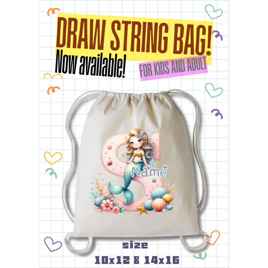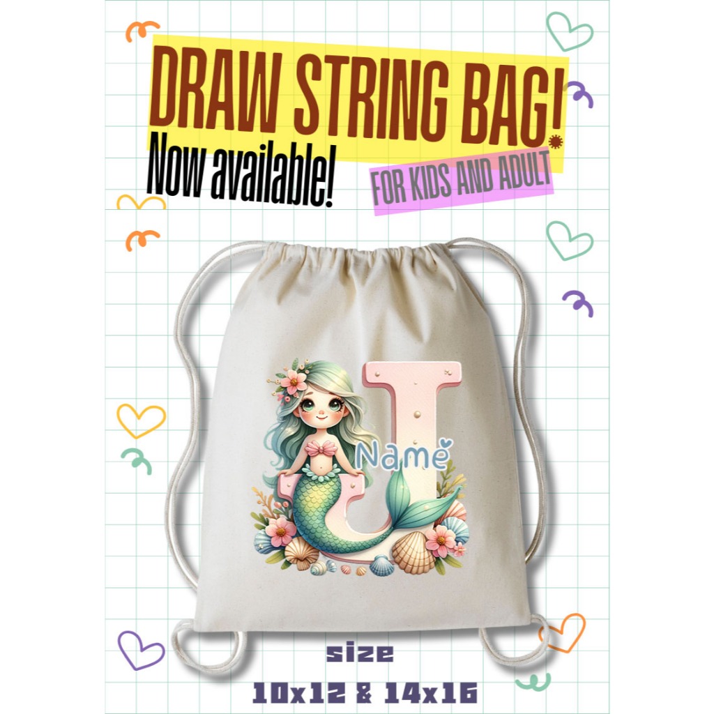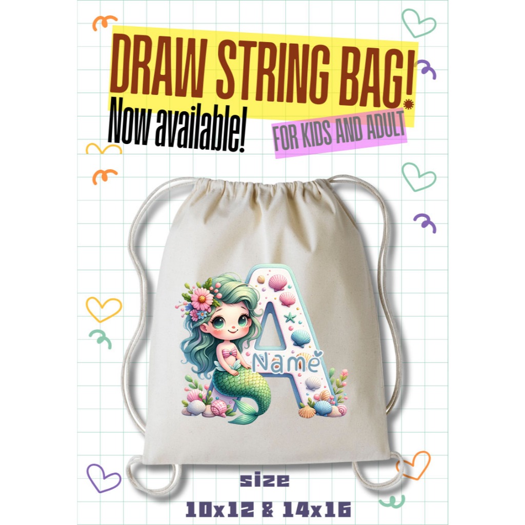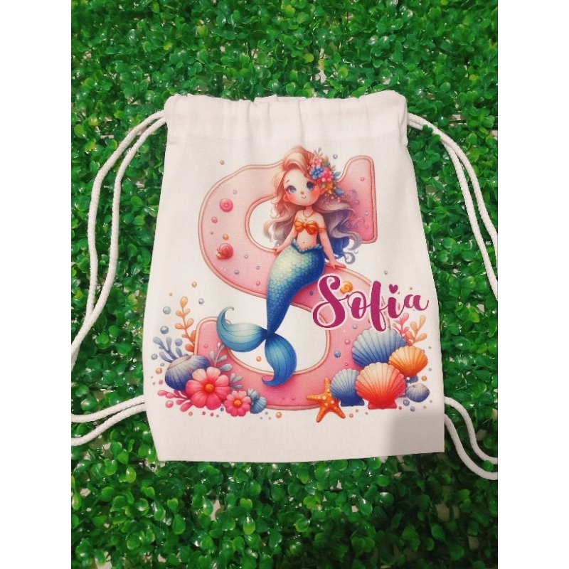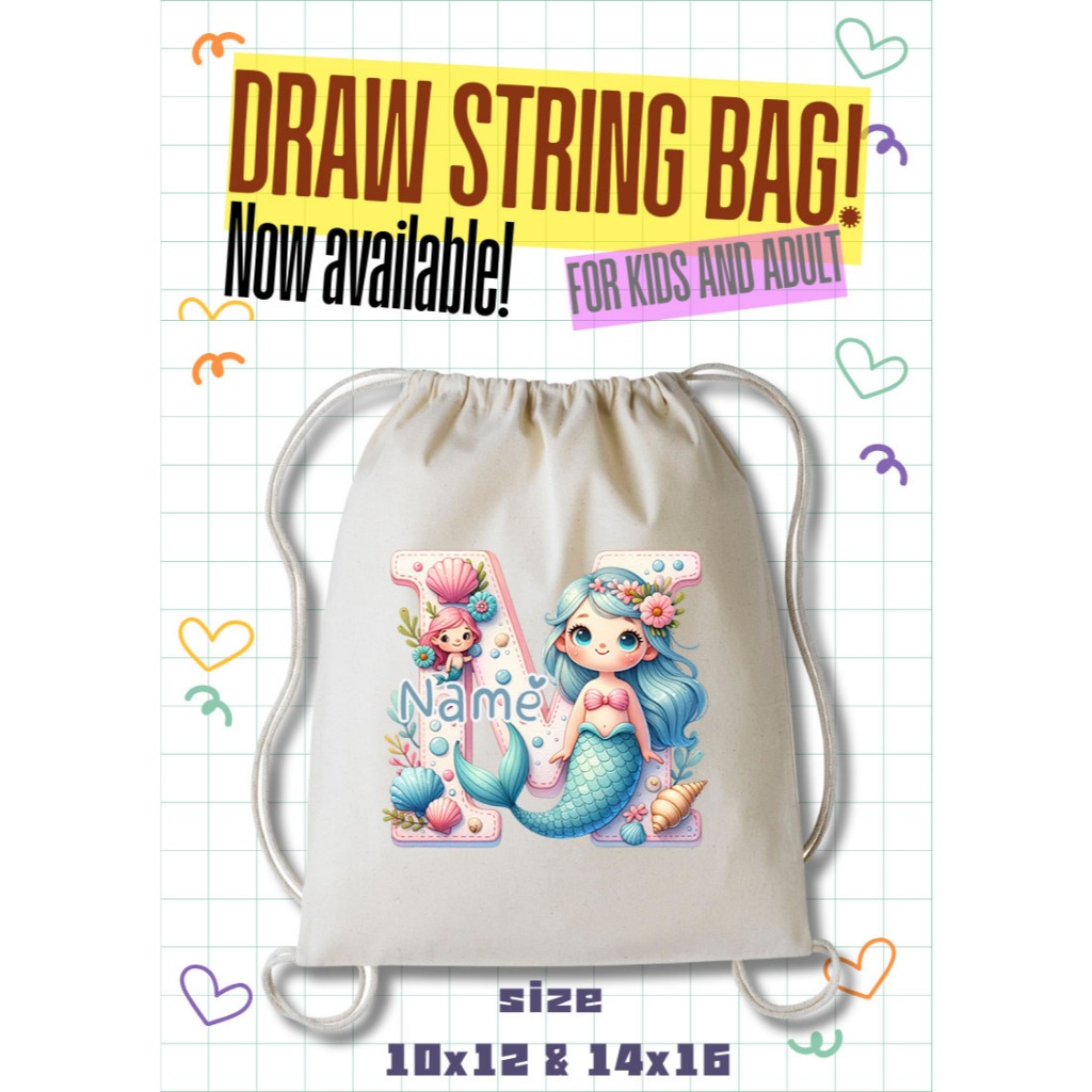 Personalized Drawstring Bag - Mermaid Initial and Name Tote Bag