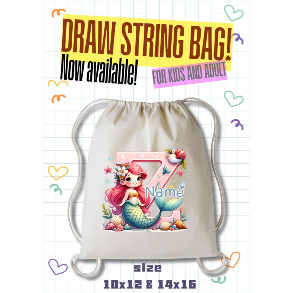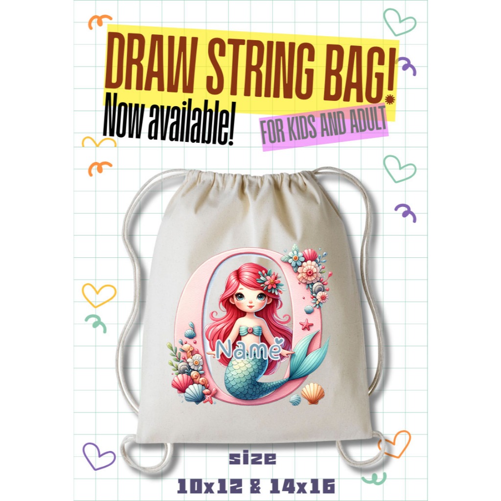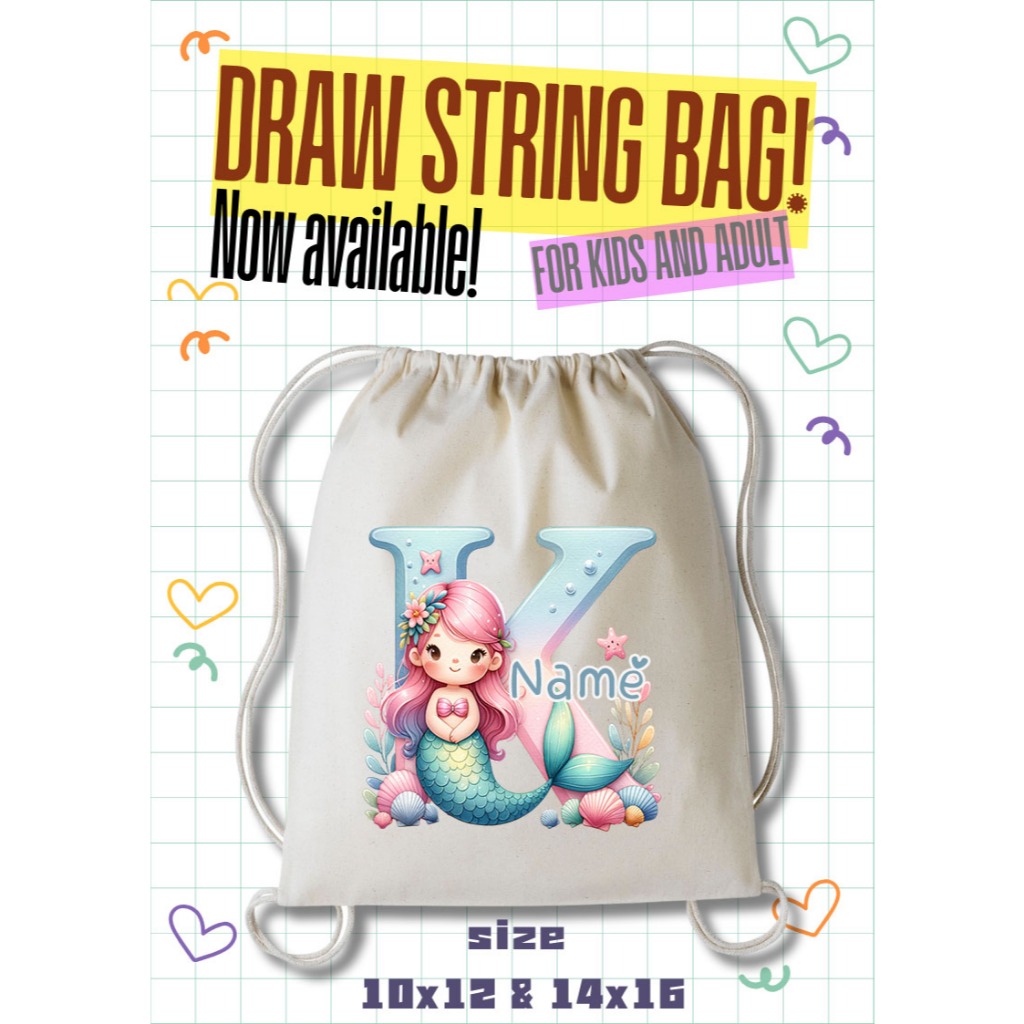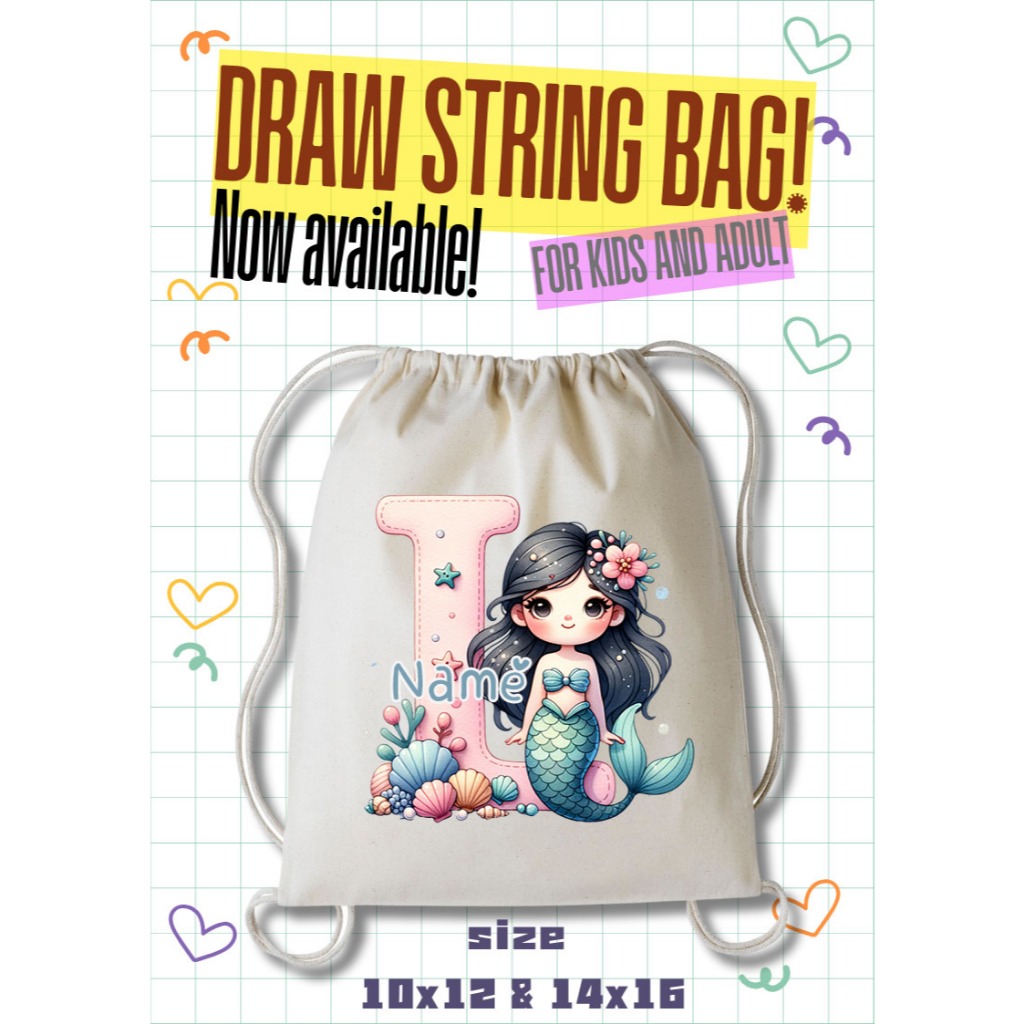 Personalized Drawstring Bag - Mermaid Initial and Name Tote Bag