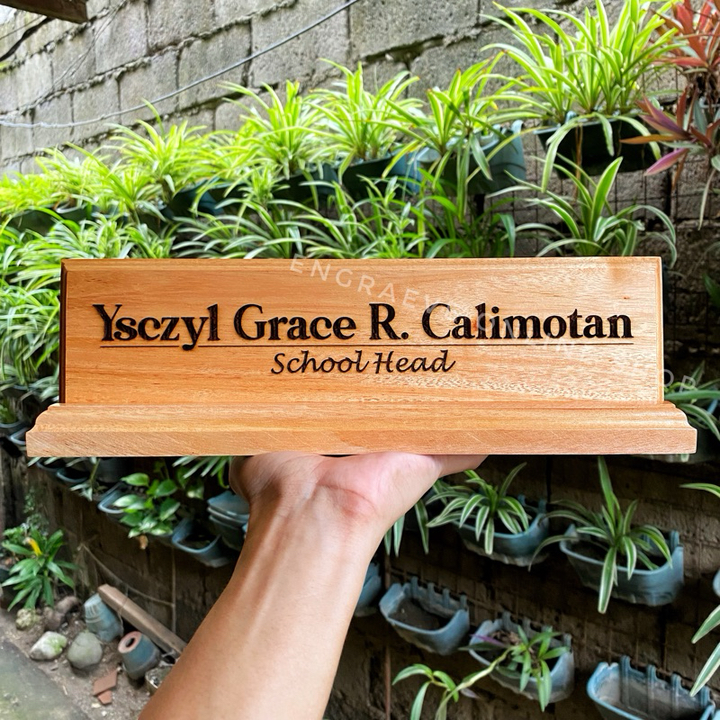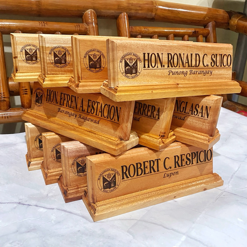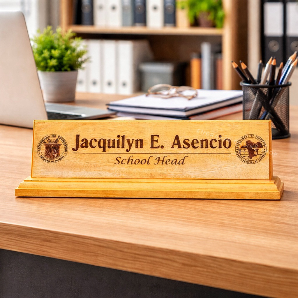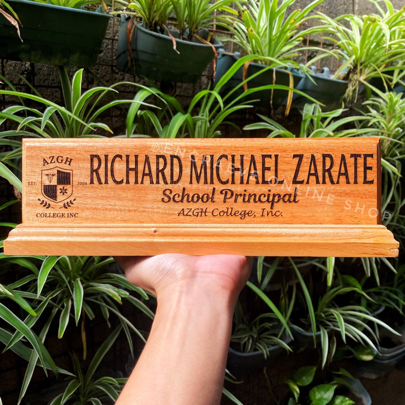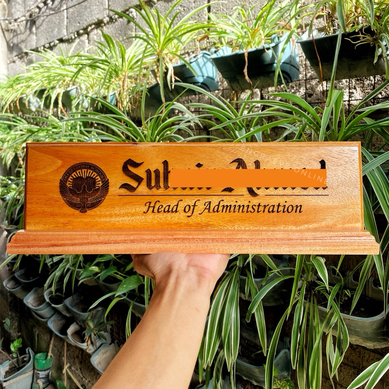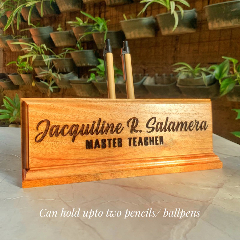 Personalized Wooden Desk Name Plate/ Table Signage with Pen Holder | Laser Engraved Text and Logo