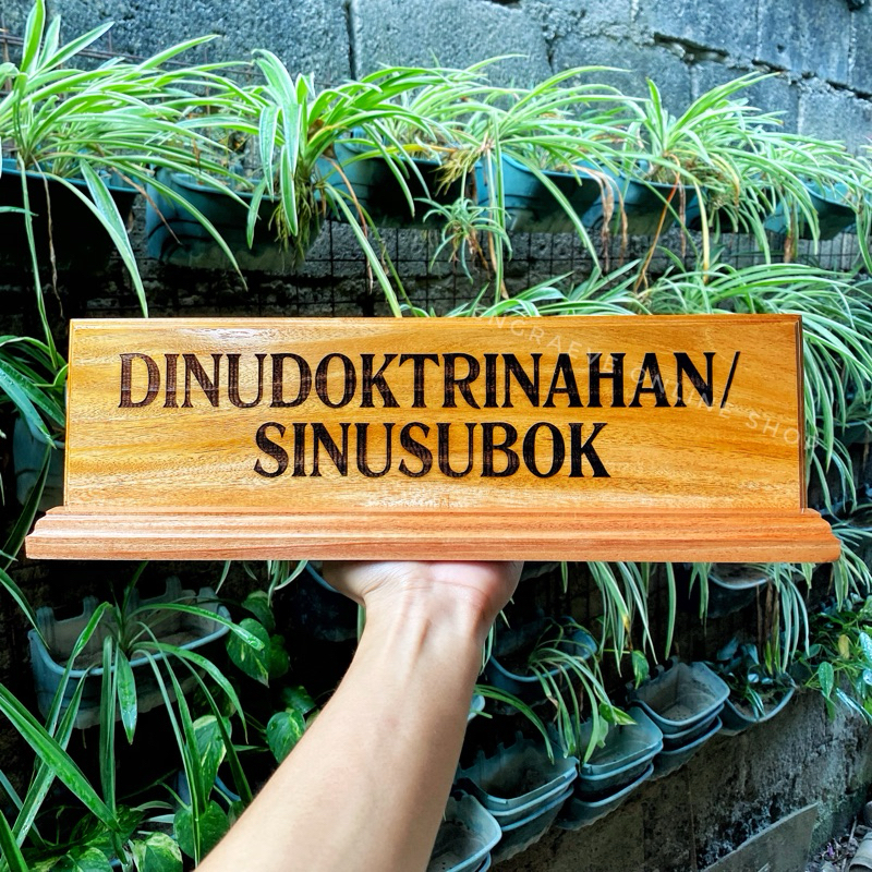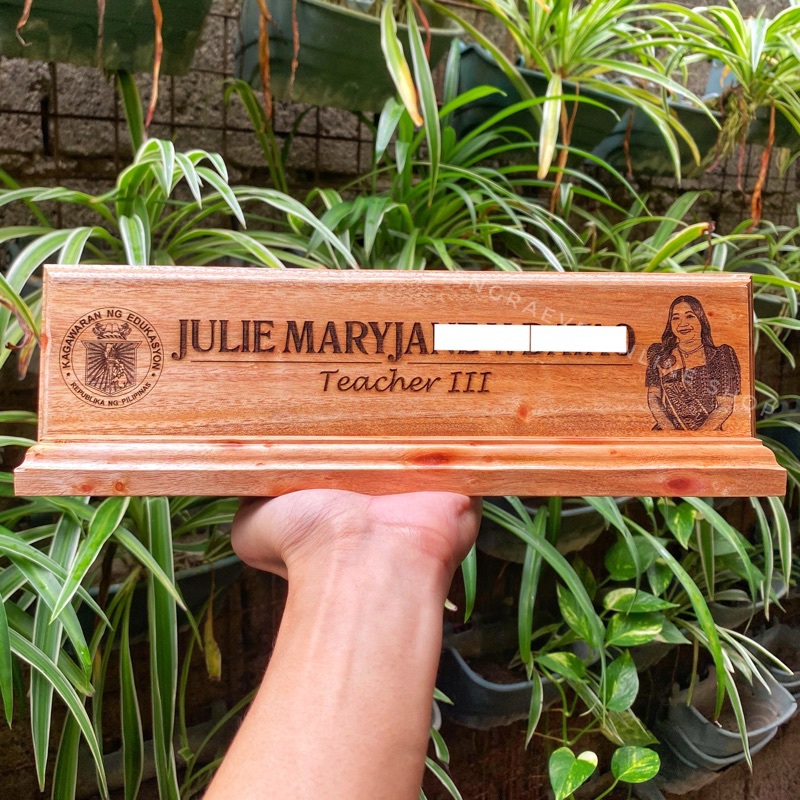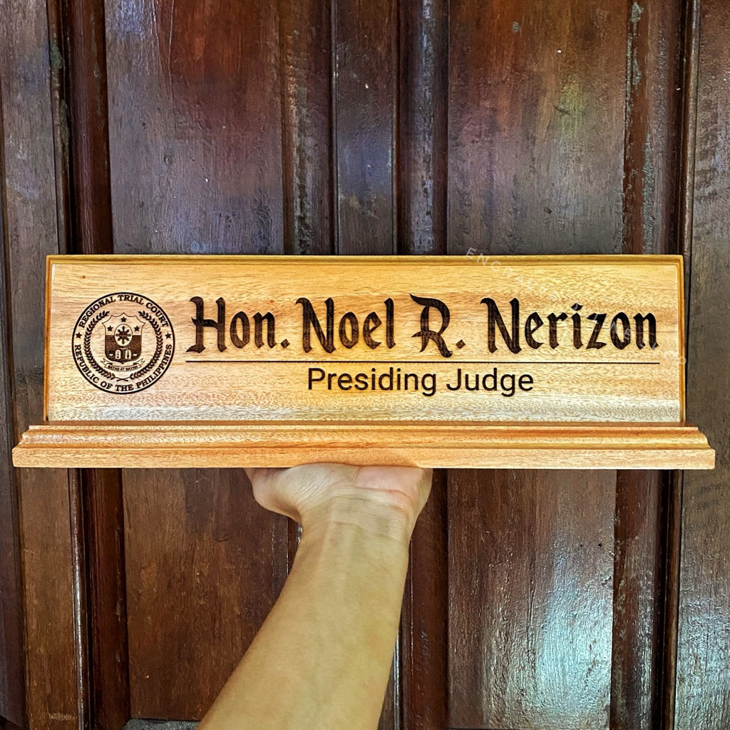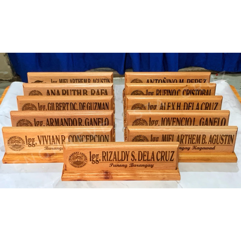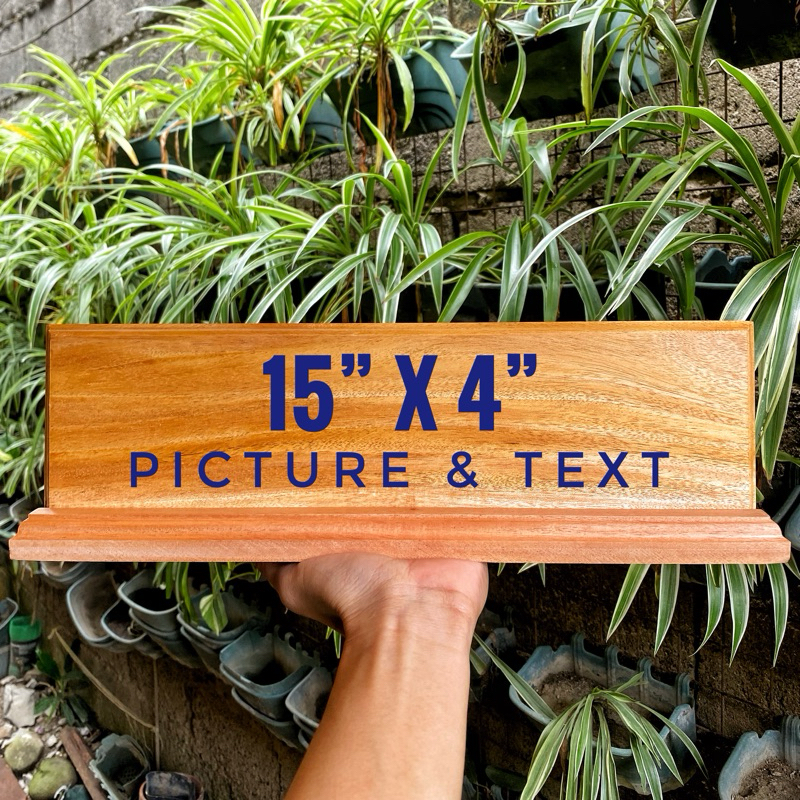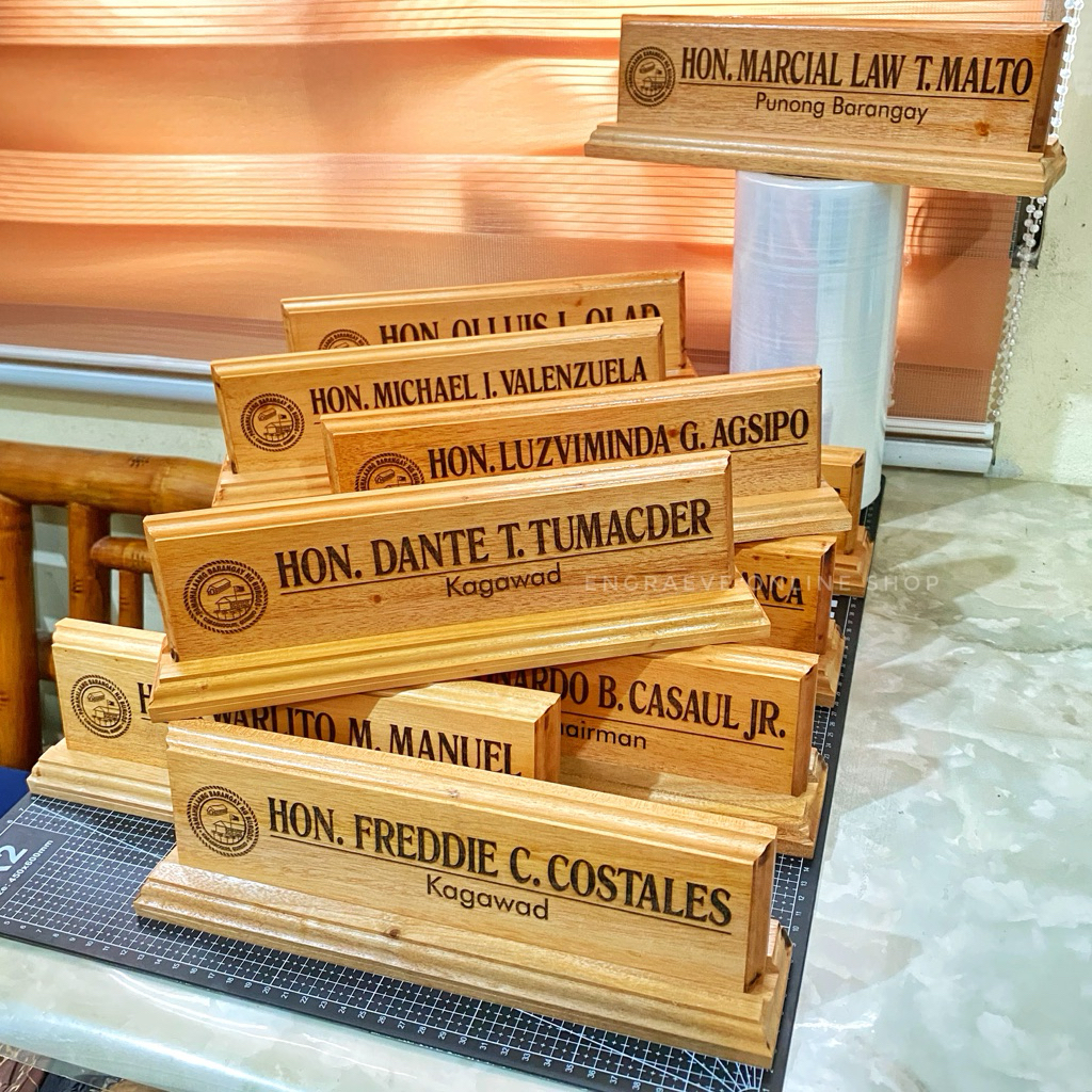 Personalized Wooden Desk Name Plate/ Table Signage with Pen Holder | Laser Engraved Text and Logo