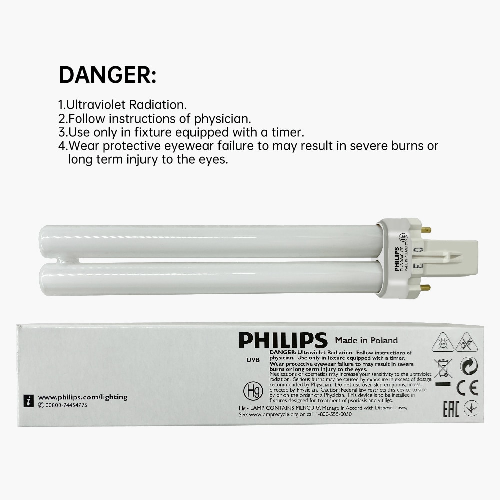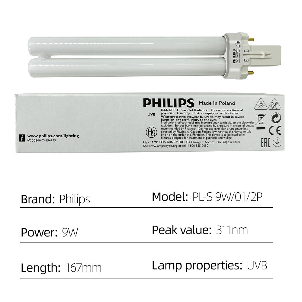 Philips 311nm Ultraviolet Phototherapy Lamp Tube UV Light Bulb UVB Lamp PL-S 9W/01/2P Narrow Band Medium Wave 311nm Suitable for Psoriasis and Vitiligo