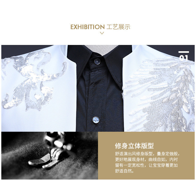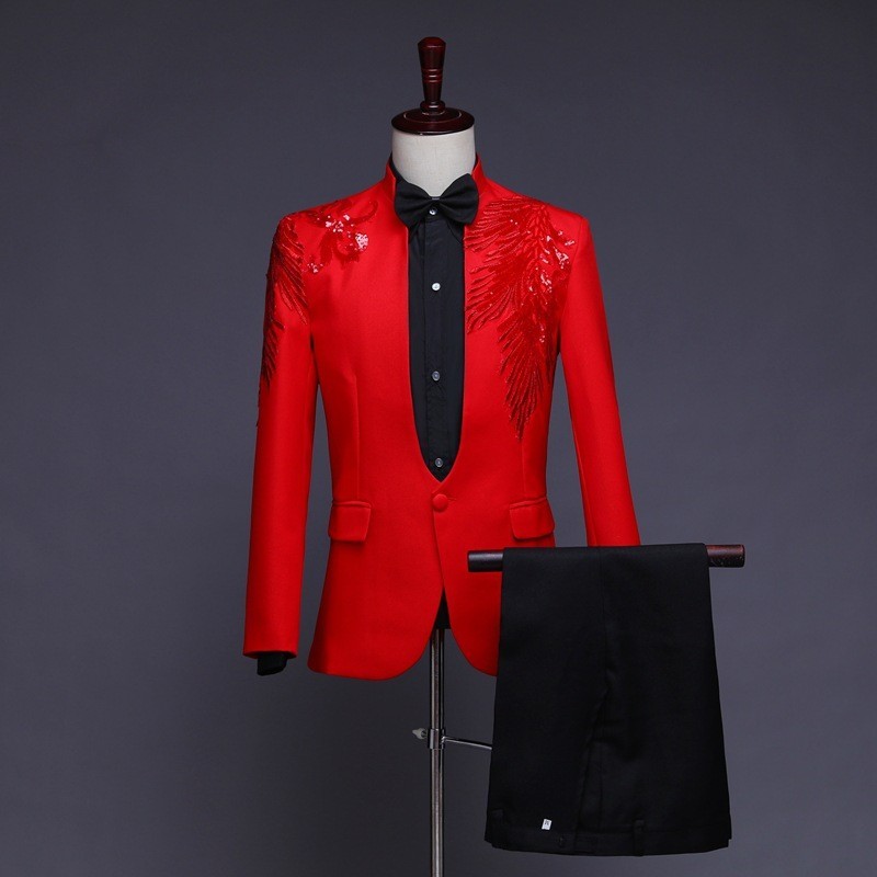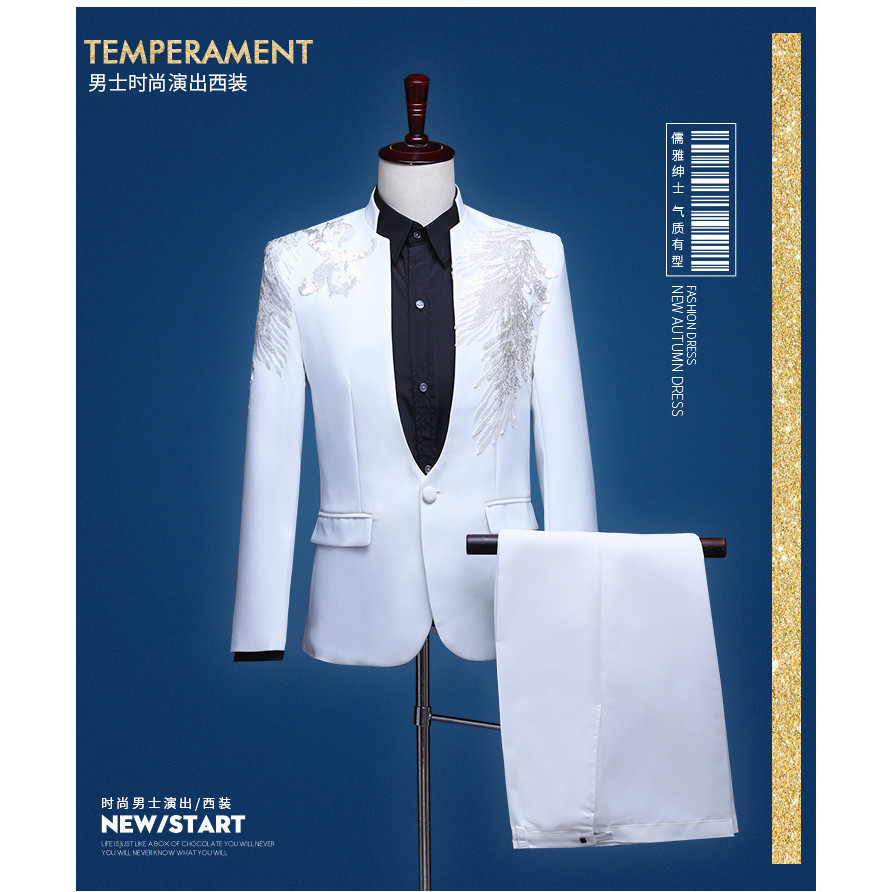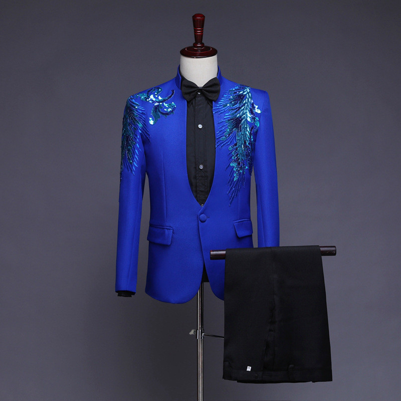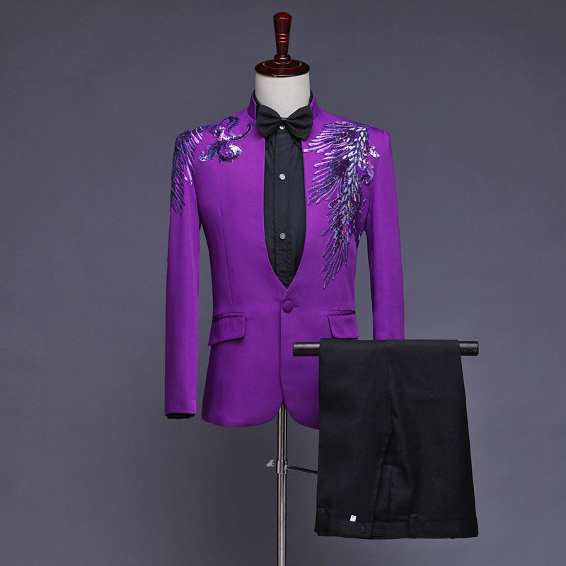 Photo Studio Men's Host Performance Suit Suit Stand-Up Collar Stage Suit Diamond Feather Flower Singer Purple Performance Costume