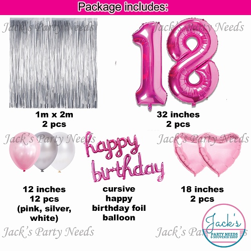 Pink Silver Happy 18th Birthday Decoration Cursive happy birthday foil and large number balloons